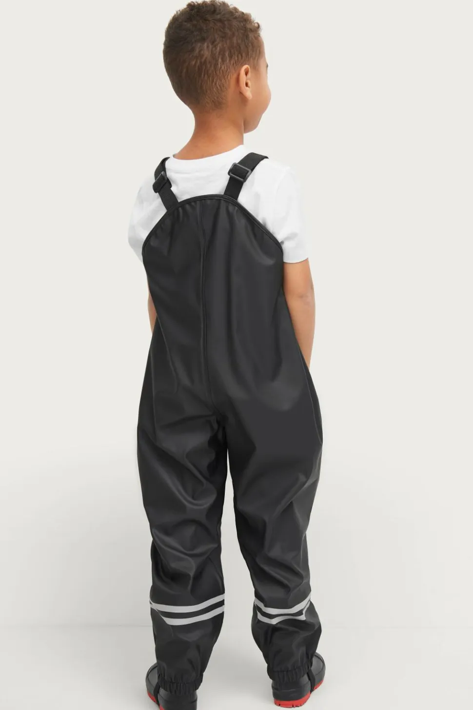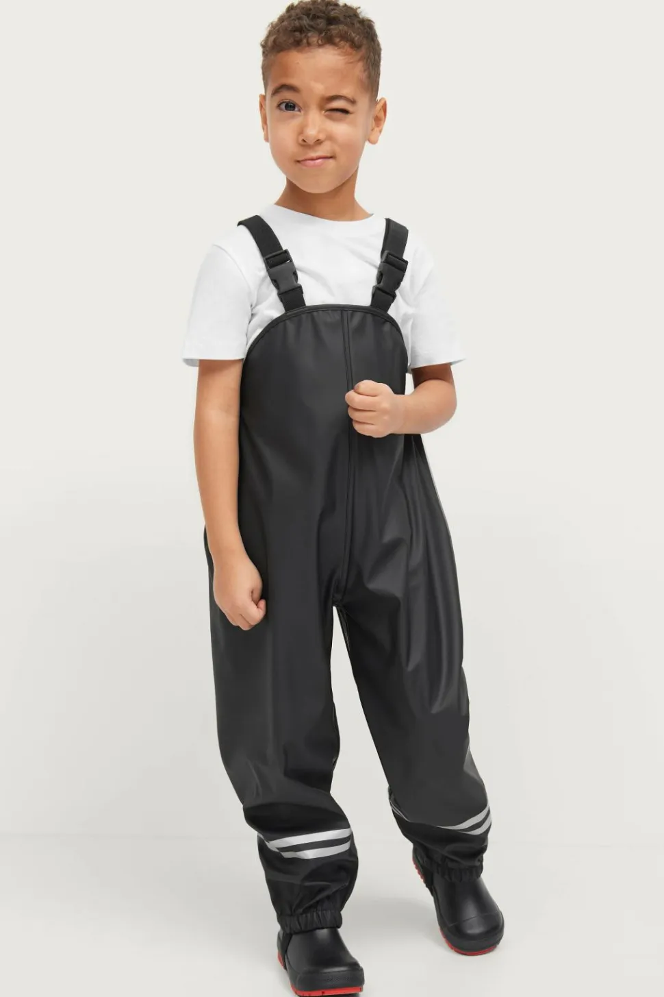 Uforede regnbukser i vandtæt gummikvalitet. Justerbare seler og regulerbar vidde foroven med trykknapper i siderne. Indsat elastik i benkant. Aftagelige, elastiske fodstropper. Striber i refleksprint på benene.