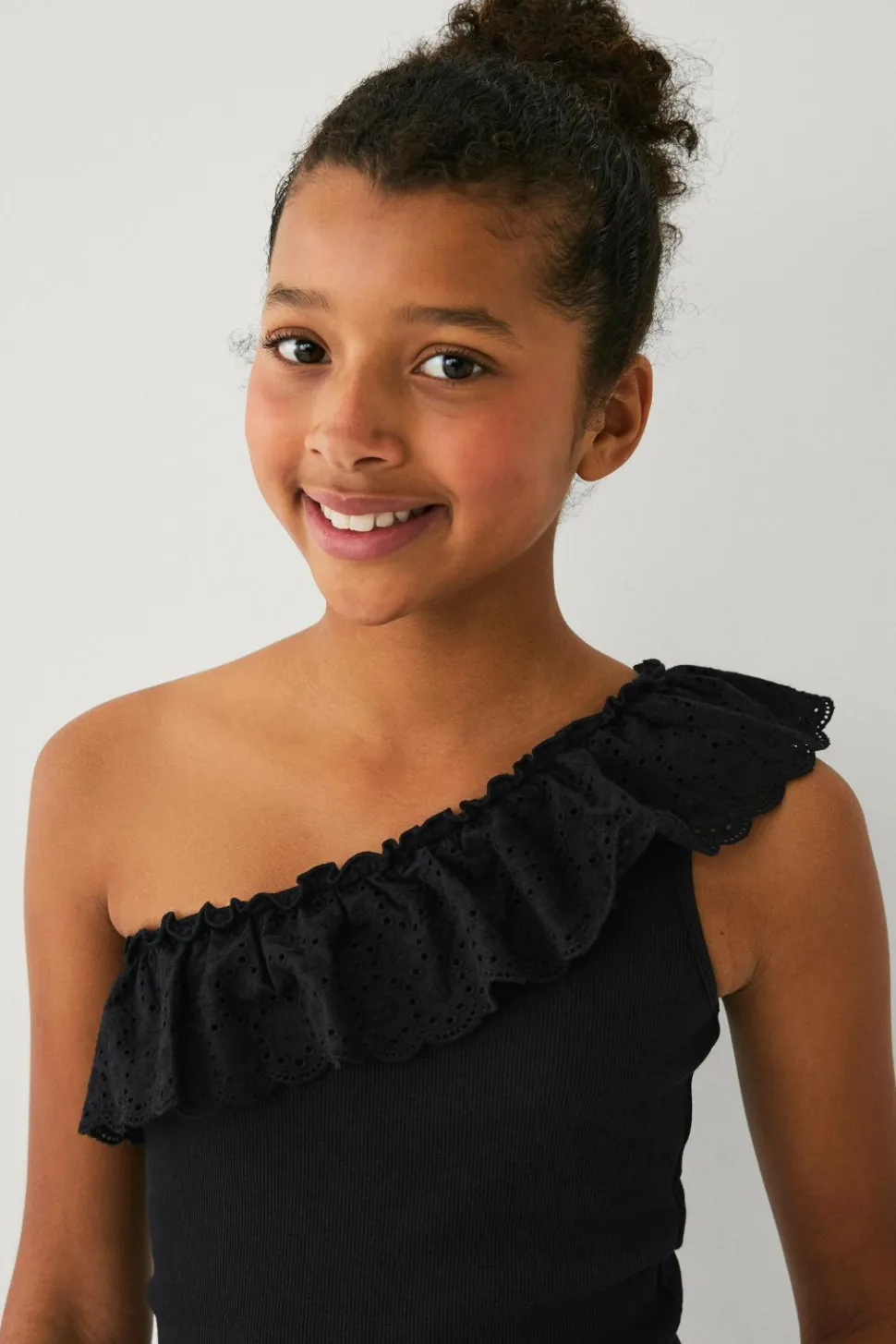 • Asymmetrisk øvre kant med hulbroderet volant