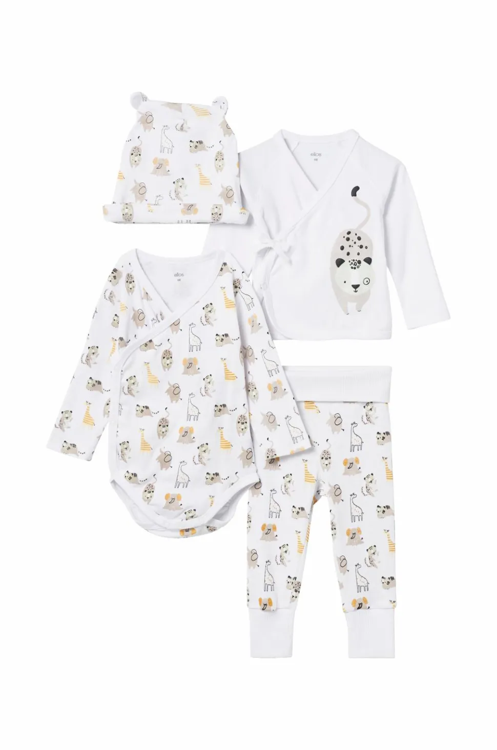 Startpakke eller gavesæt i 4 dele til babyens første tid. Blød økologisk bomuldsjersey.