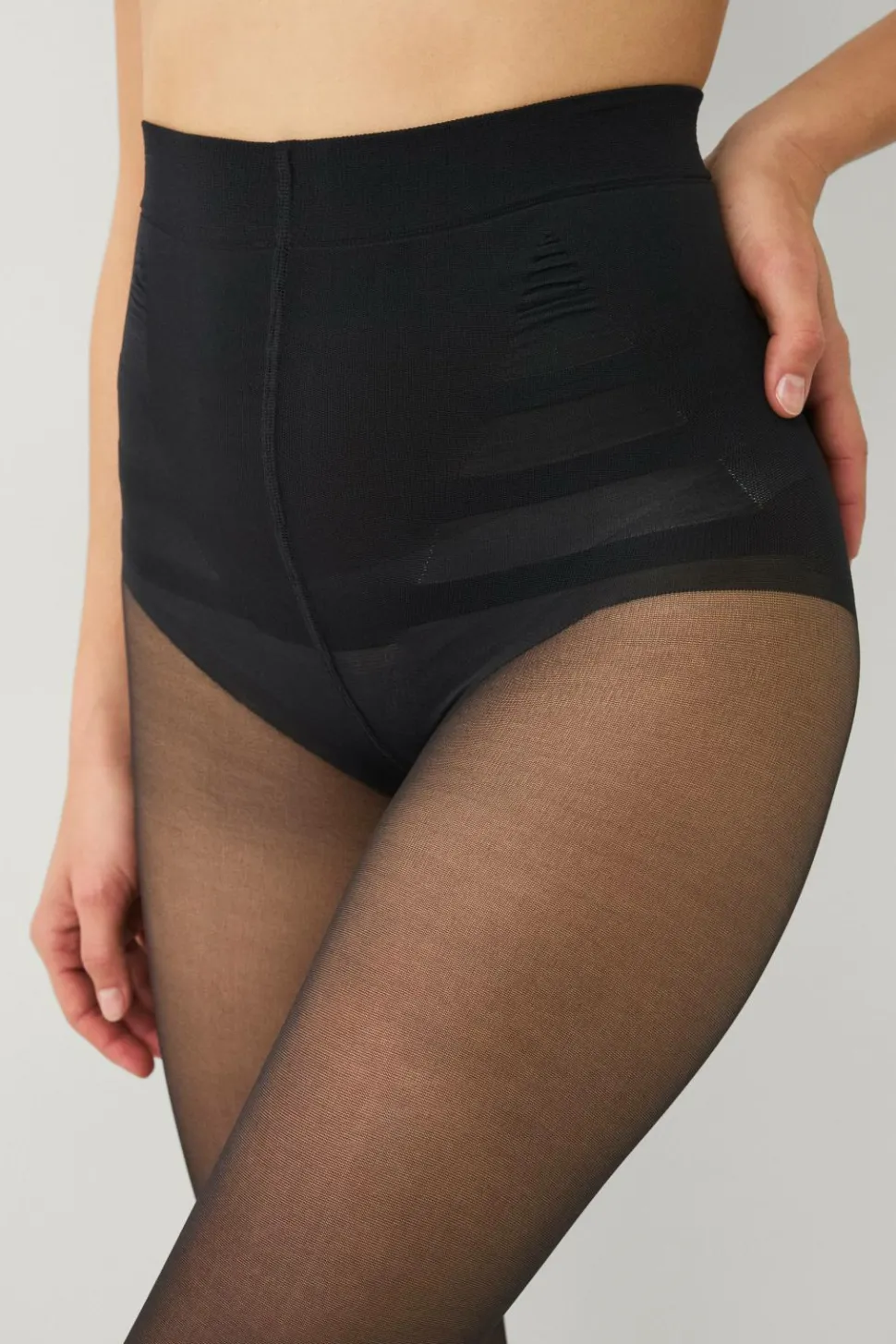 • Strømpebukser, der former sig og holder på hele for- og bagsiden af trusserne