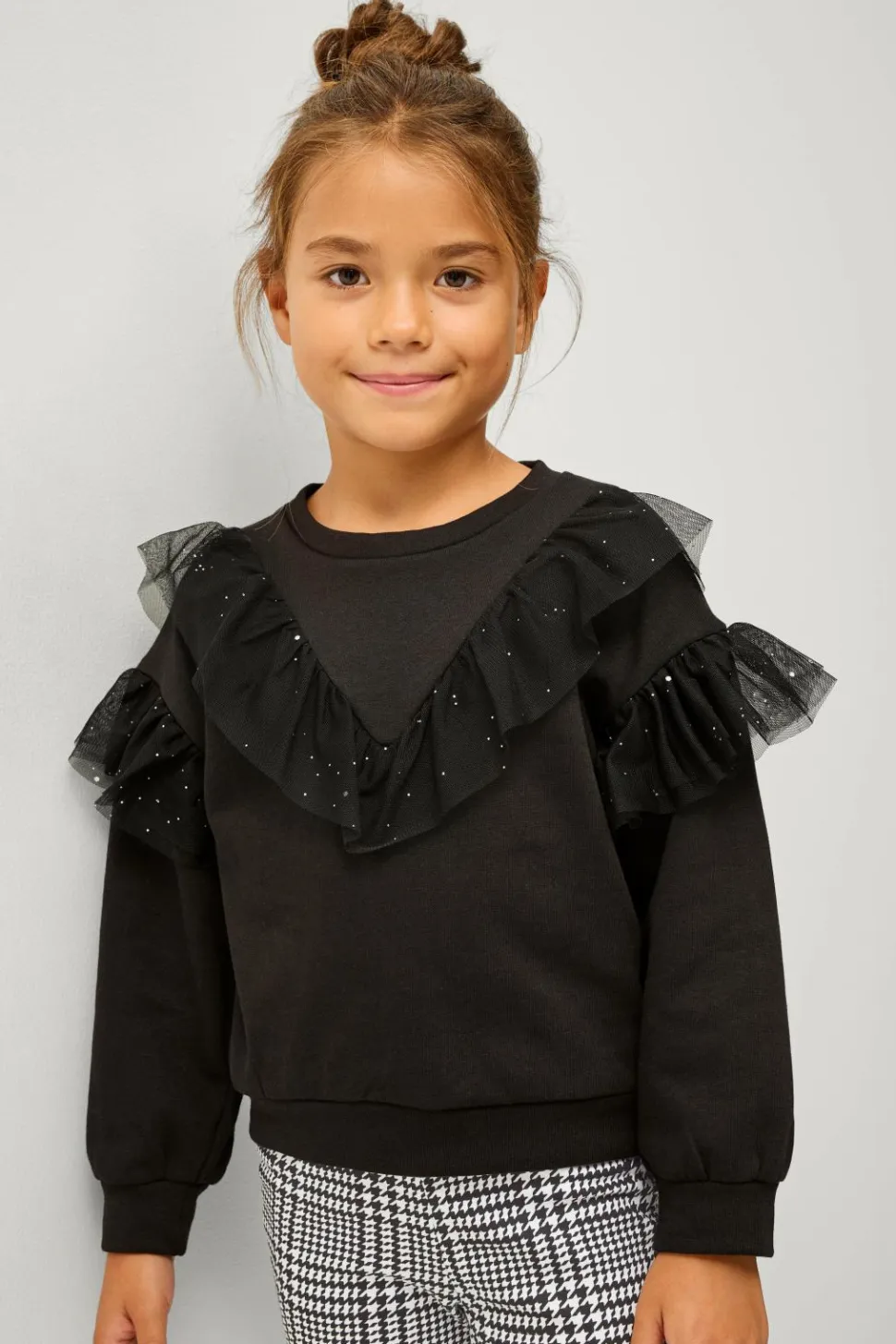 • Glitrende volanter i mesh foran og omkring ærmerne