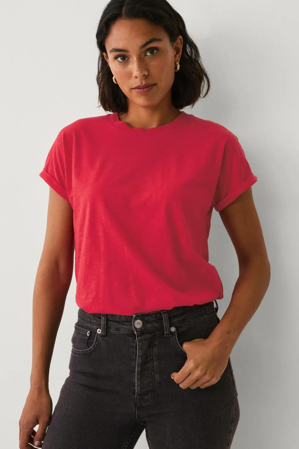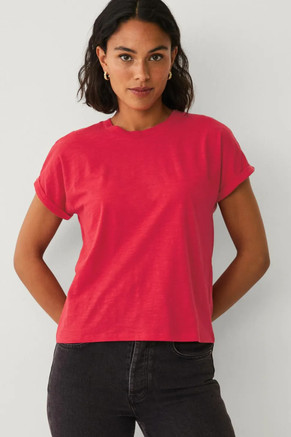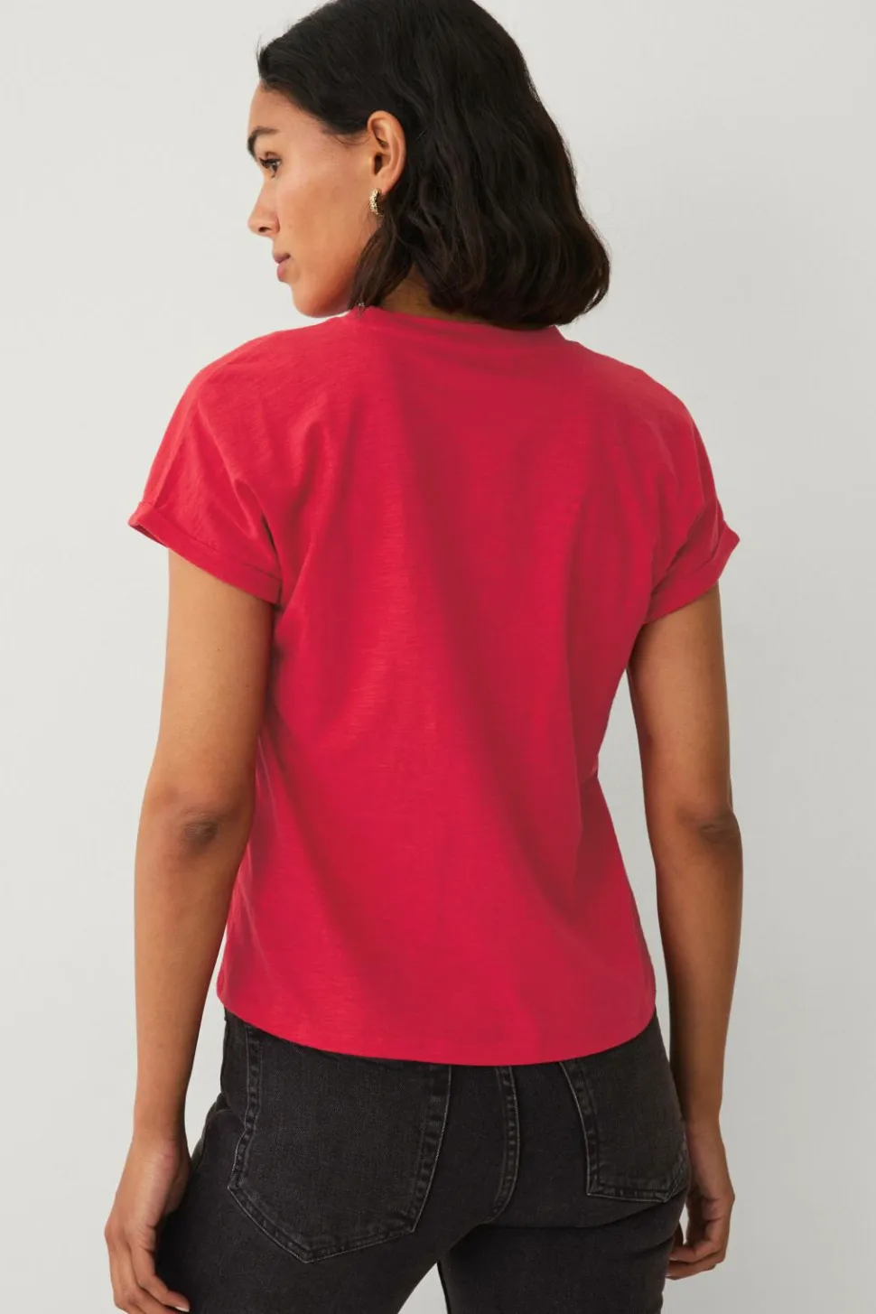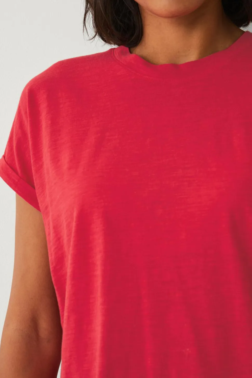 • Nedsænket skulder med kort ærme og fæstet oprullet