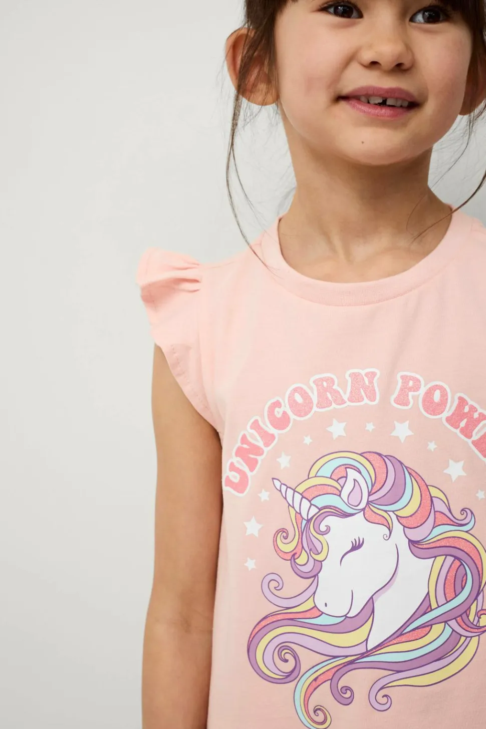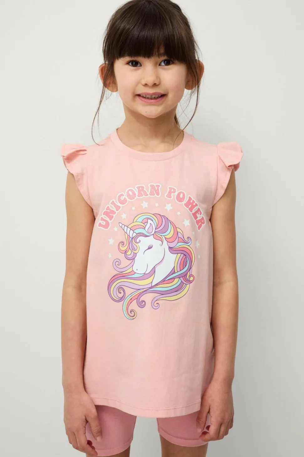 • Ærmeløs top med tryk foran og volanter på skuldrene