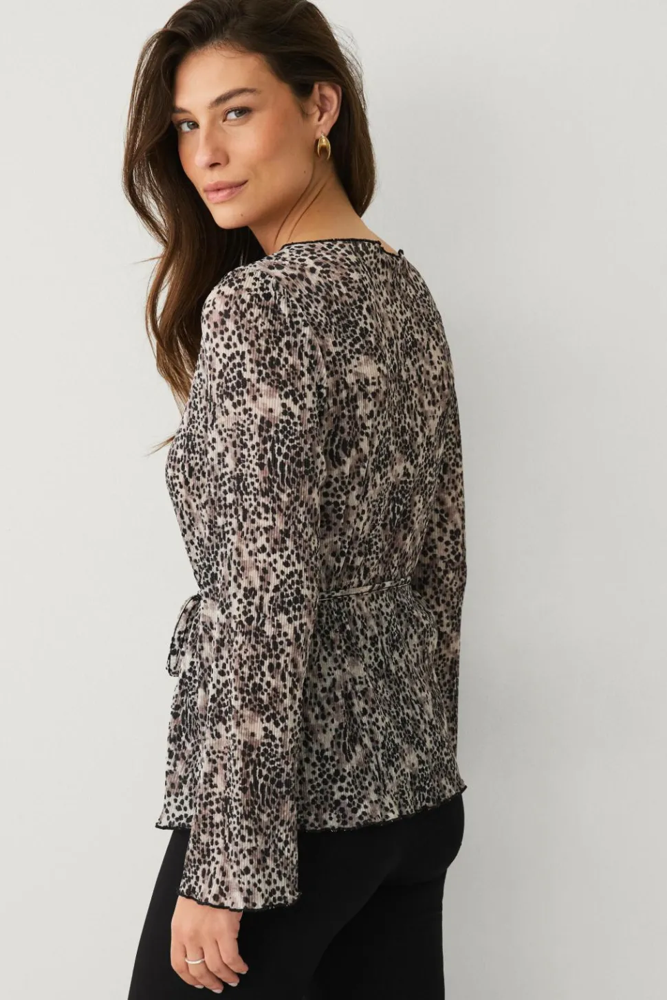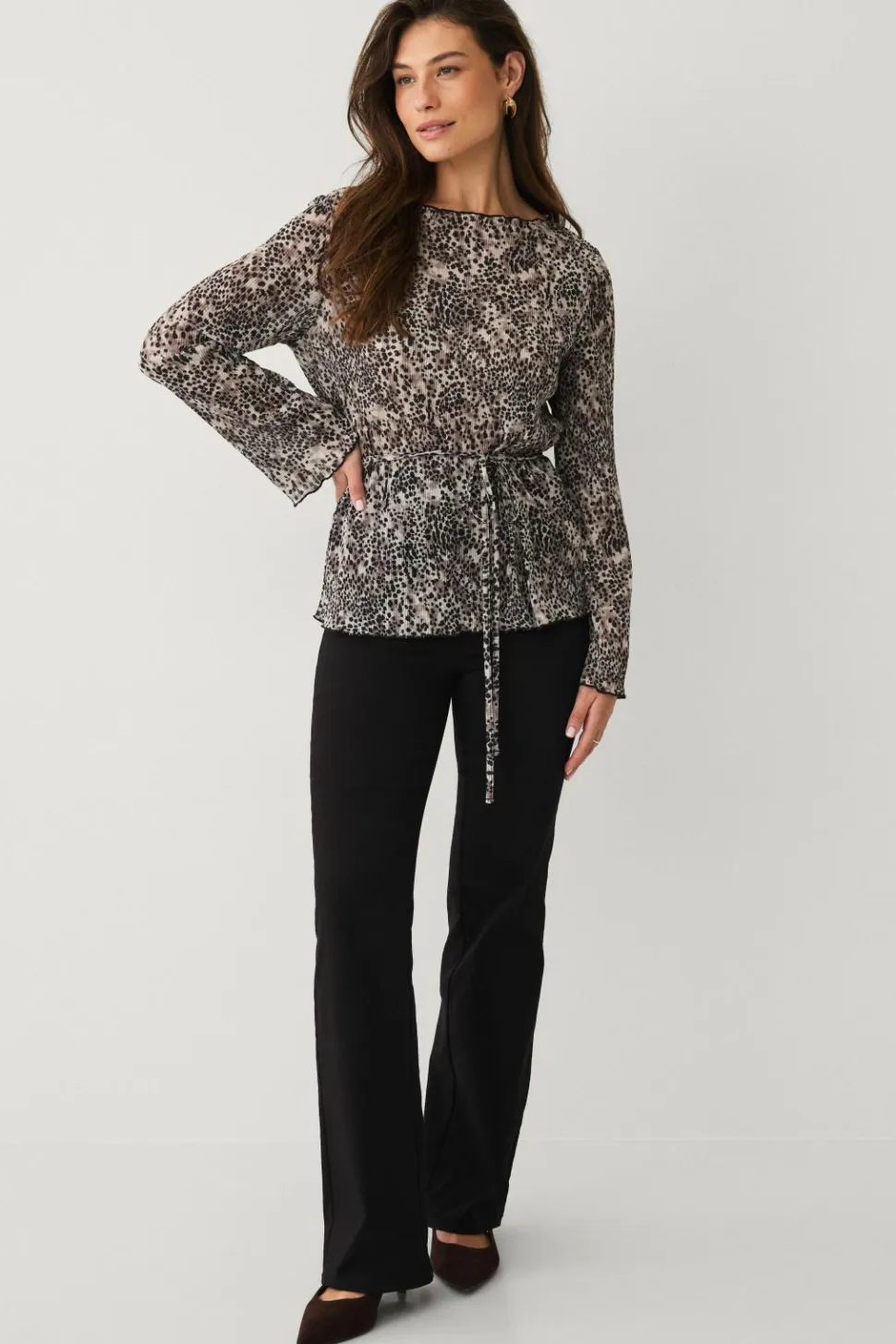 • Langærmet top med plisseret materiale og Bådhals