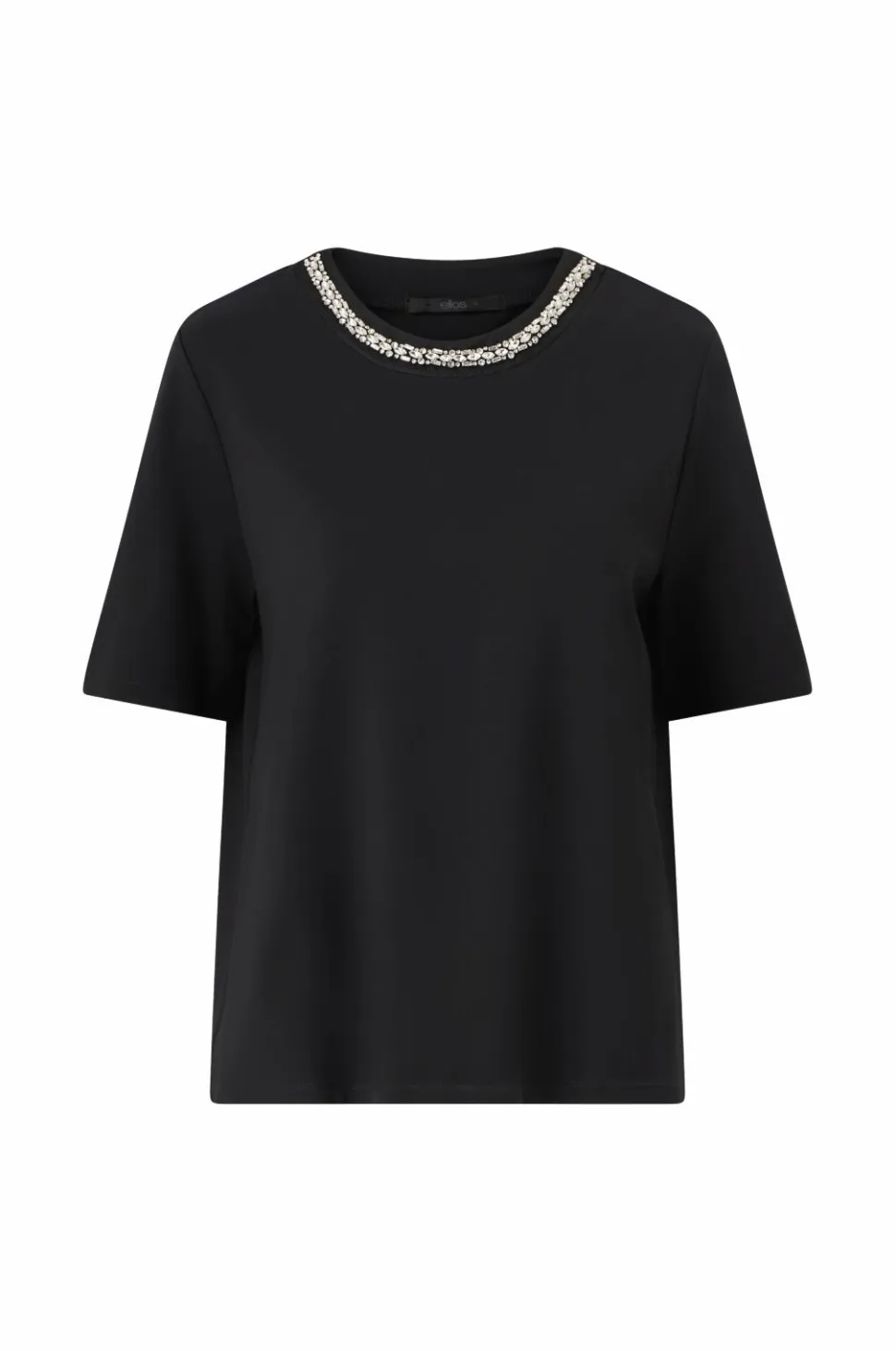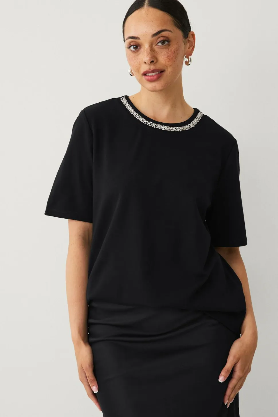 • Rund halsudskæring med mesh og dekorative, funklende sten