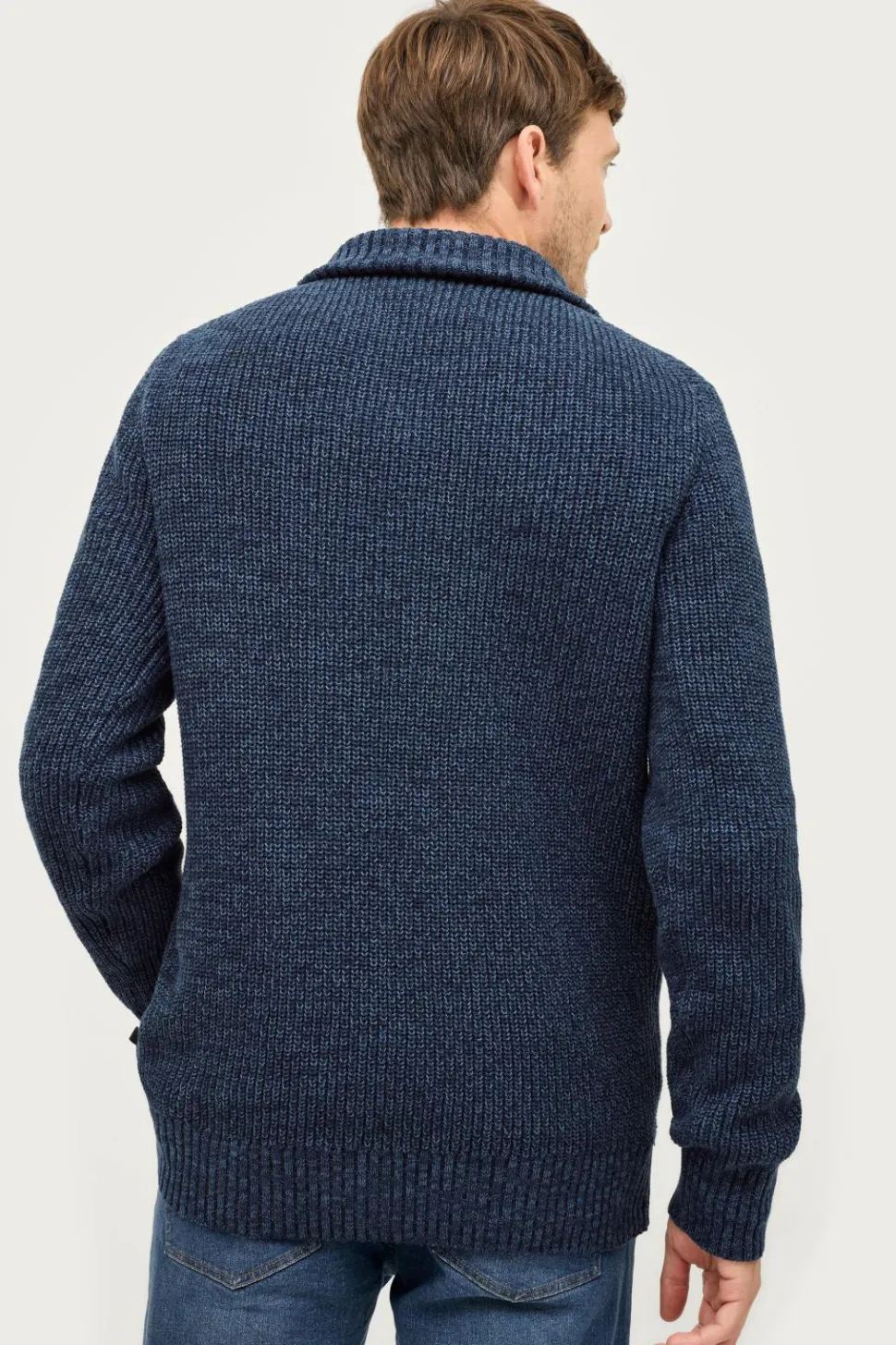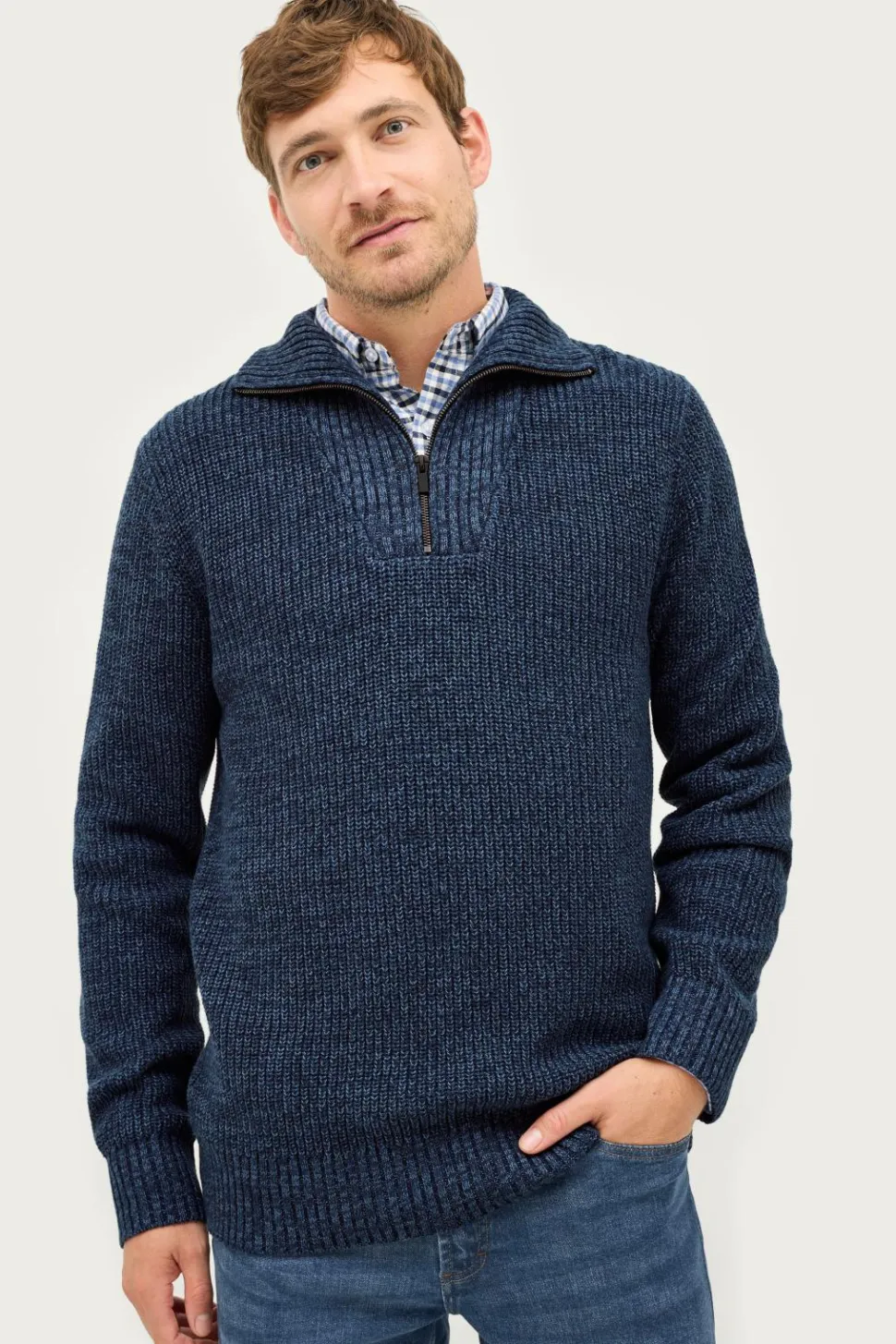 • Ribstrikket opretstående krave med lynlås