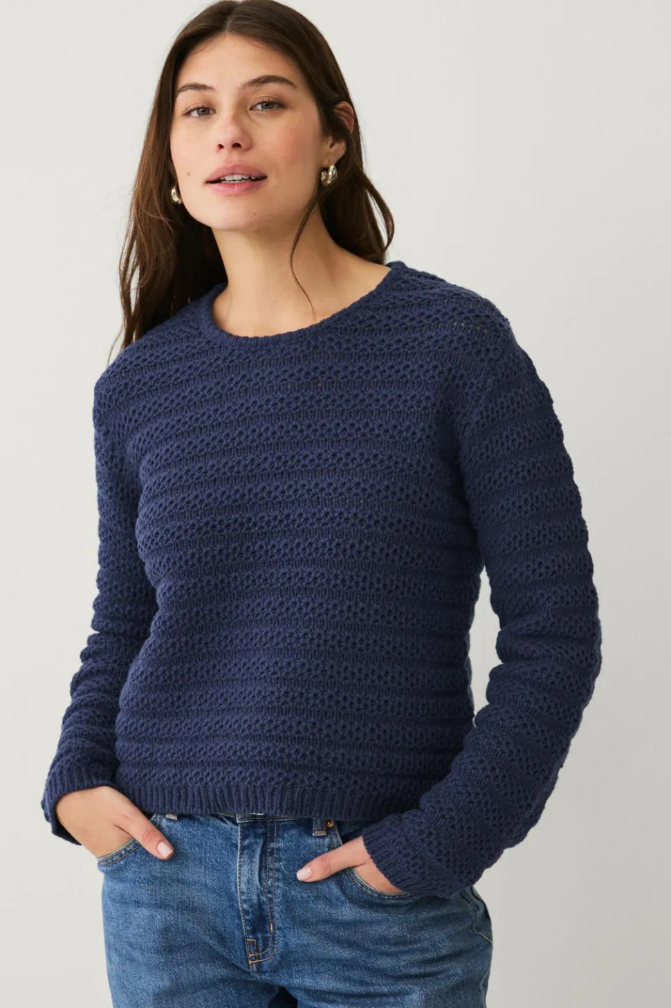 • Strukturstrikket Pullover med løststrikkede partier