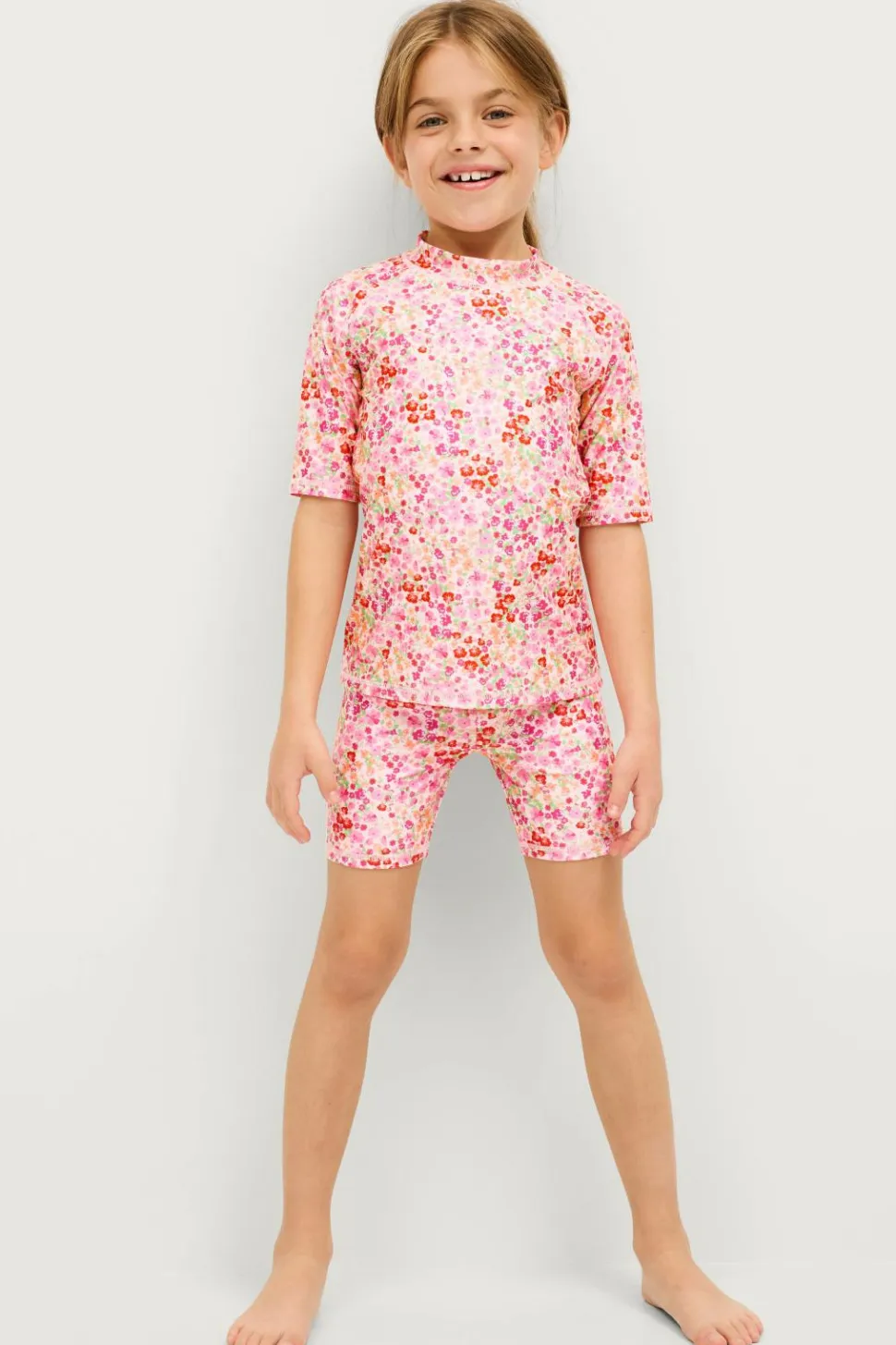 Solbeskyttelsessæt i to dele. Kortærmet top med rund hals og shorts med elastisk talje.