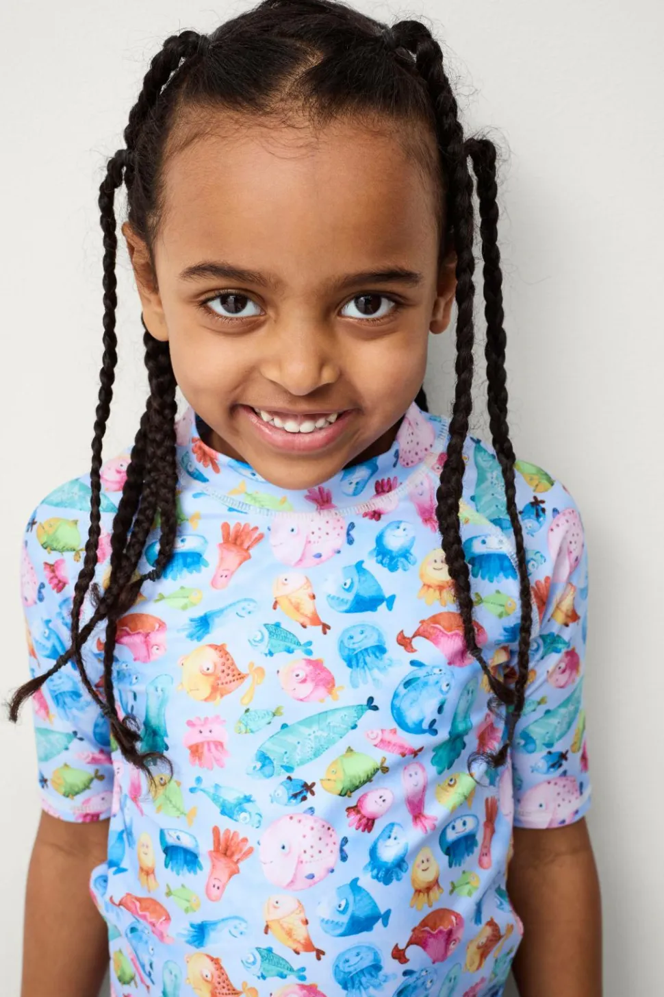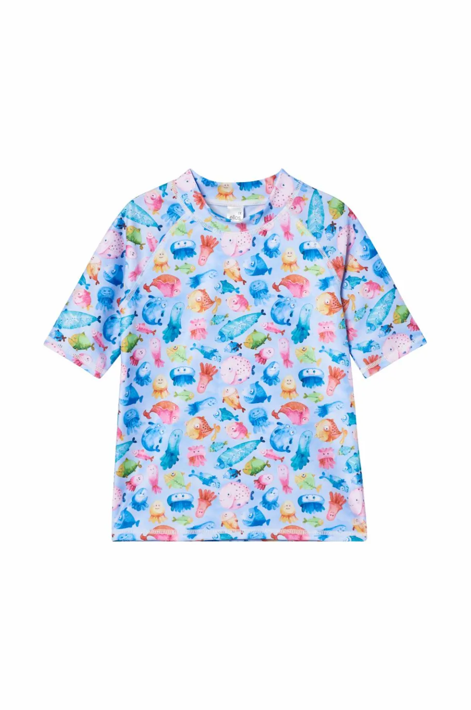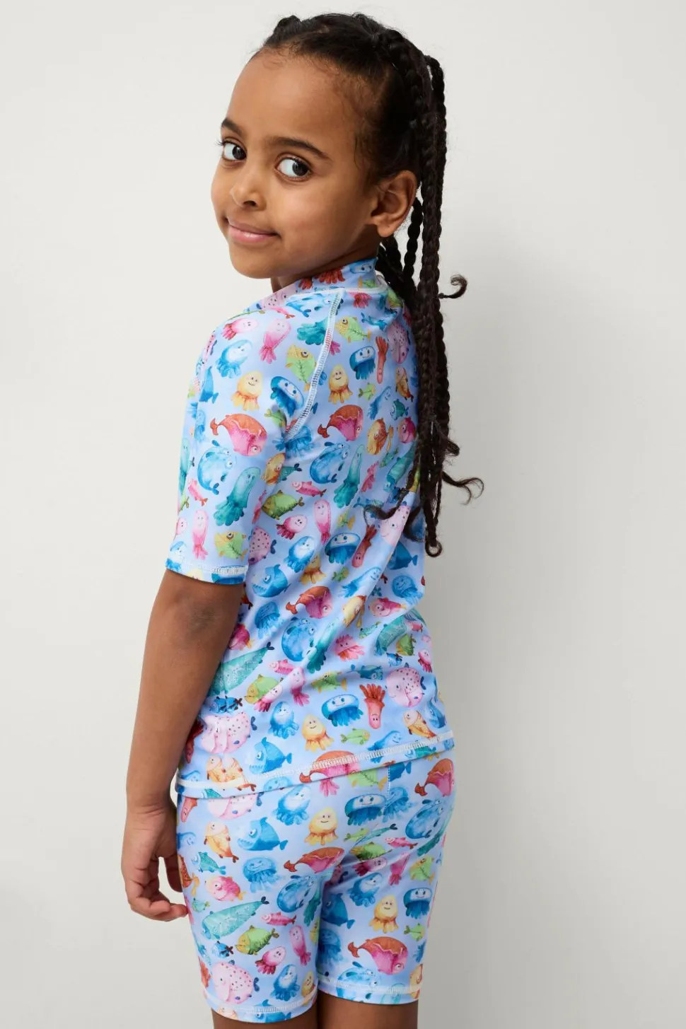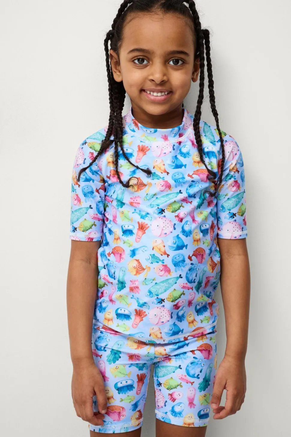 Solbeskyttelsessæt i to dele. Kortærmet top med rund hals og shorts med elastisk talje.