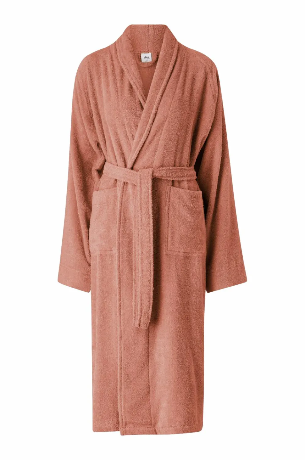 Badekåbe af 100% bomuldsfrotté med krave, to lommer og bindebælte. Længde 120 cm i str. 38/40.