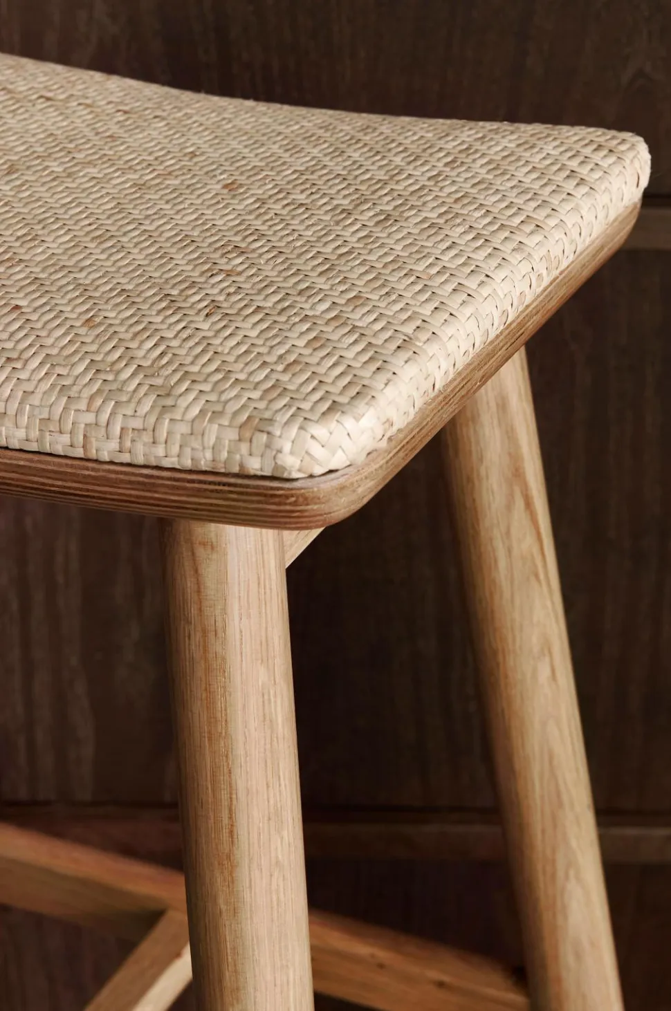 Stabil barstol i eg med vatteret sæde i flettet rotting. Bredde 47,5 cm, højde 66 cm, dybde 40 cm. Siddehøjde 65,5 cm. Sæde: 29 x 40 cm. Samlet.