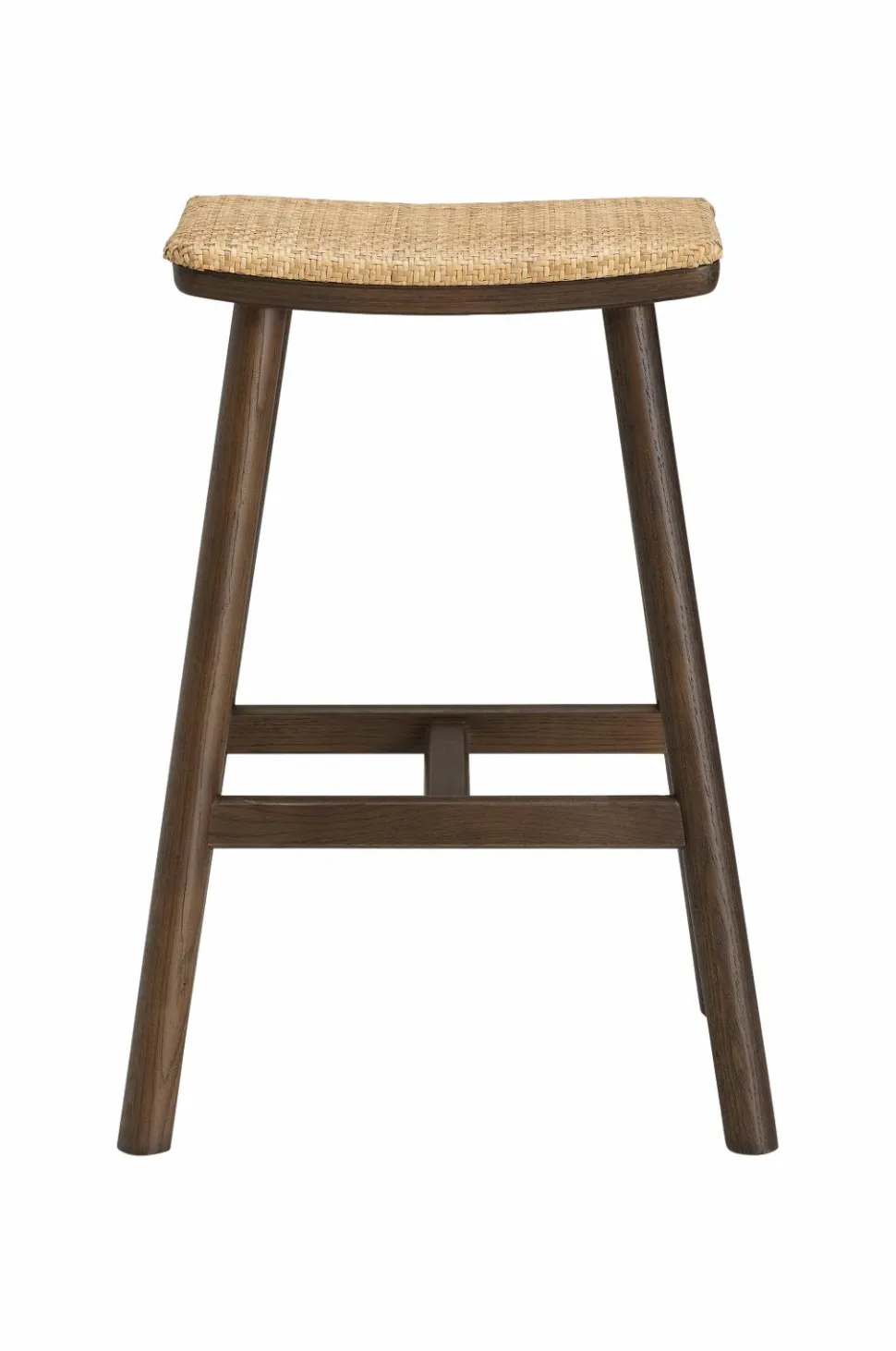 Stabil barstol i eg med vatteret sæde i flettet rotting. Bredde 47,5 cm, højde 66 cm, dybde 40 cm. Siddehøjde 65,5 cm. Sæde: 29 x 40 cm. Samlet.