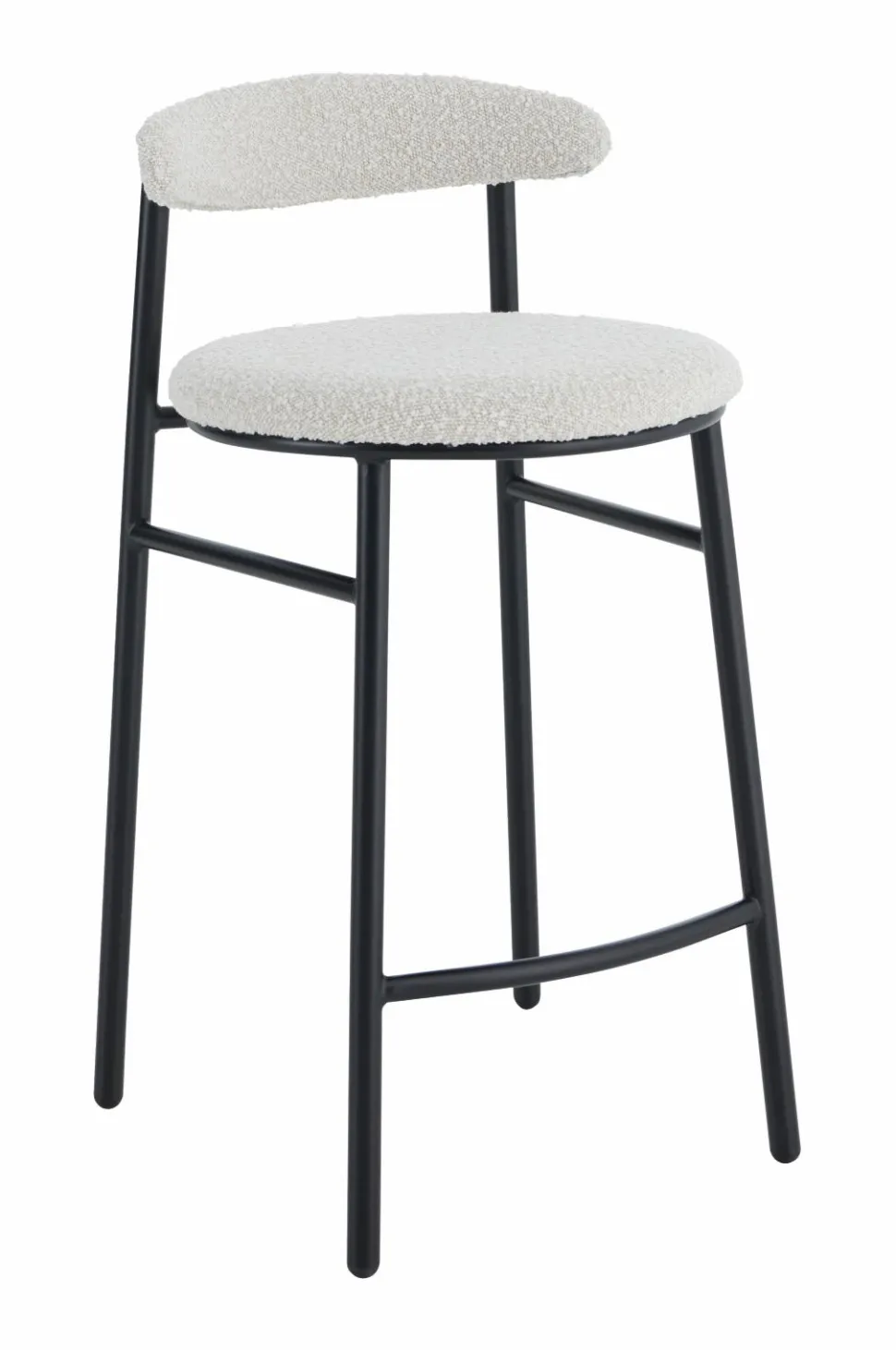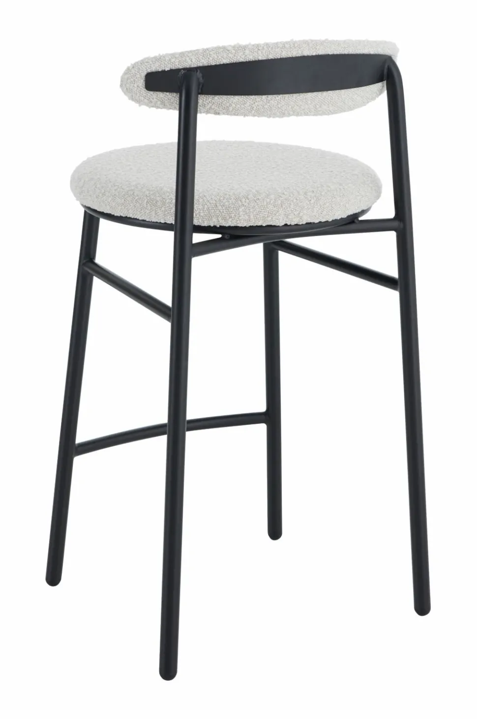 Barstol i moderne design med rundt sæde og svungen ryg. Sæde og ryg med betræk i boucléstof og skumfyld. Stel og ben i pulverlakeret metal. Ryglæn højde 21 cm. Maks. belastning 120 kg.