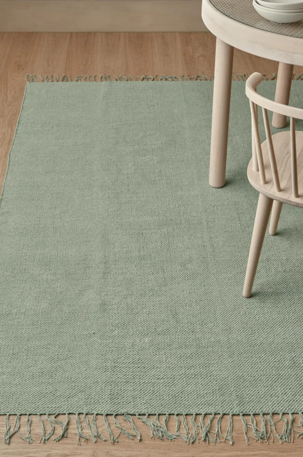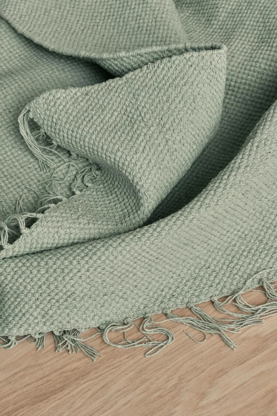Glatvævet bomuldstæppe med farvede frynser. Højde 0,5 cm.
