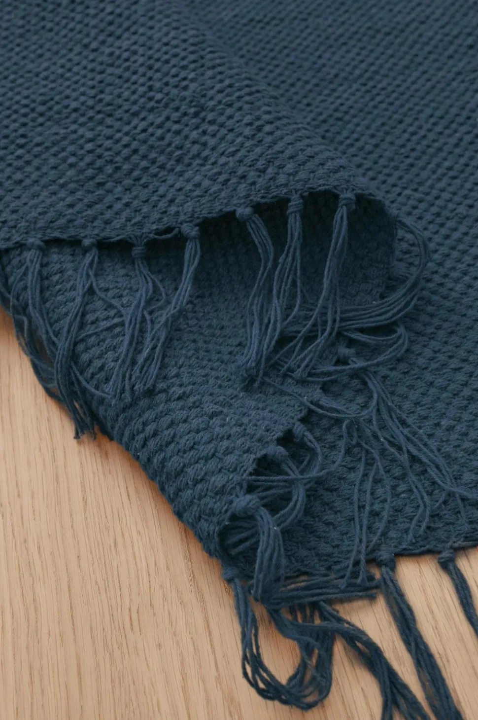 Glatvævet bomuldstæppe med farvede frynser. Højde 0,5 cm.