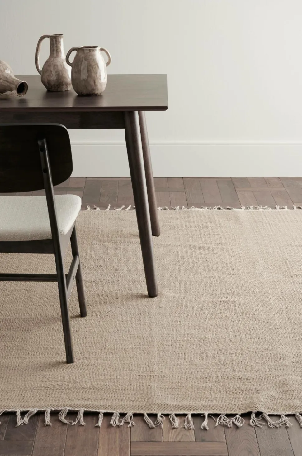 Glatvævet bomuldstæppe med farvede frynser. Højde 0,5 cm.