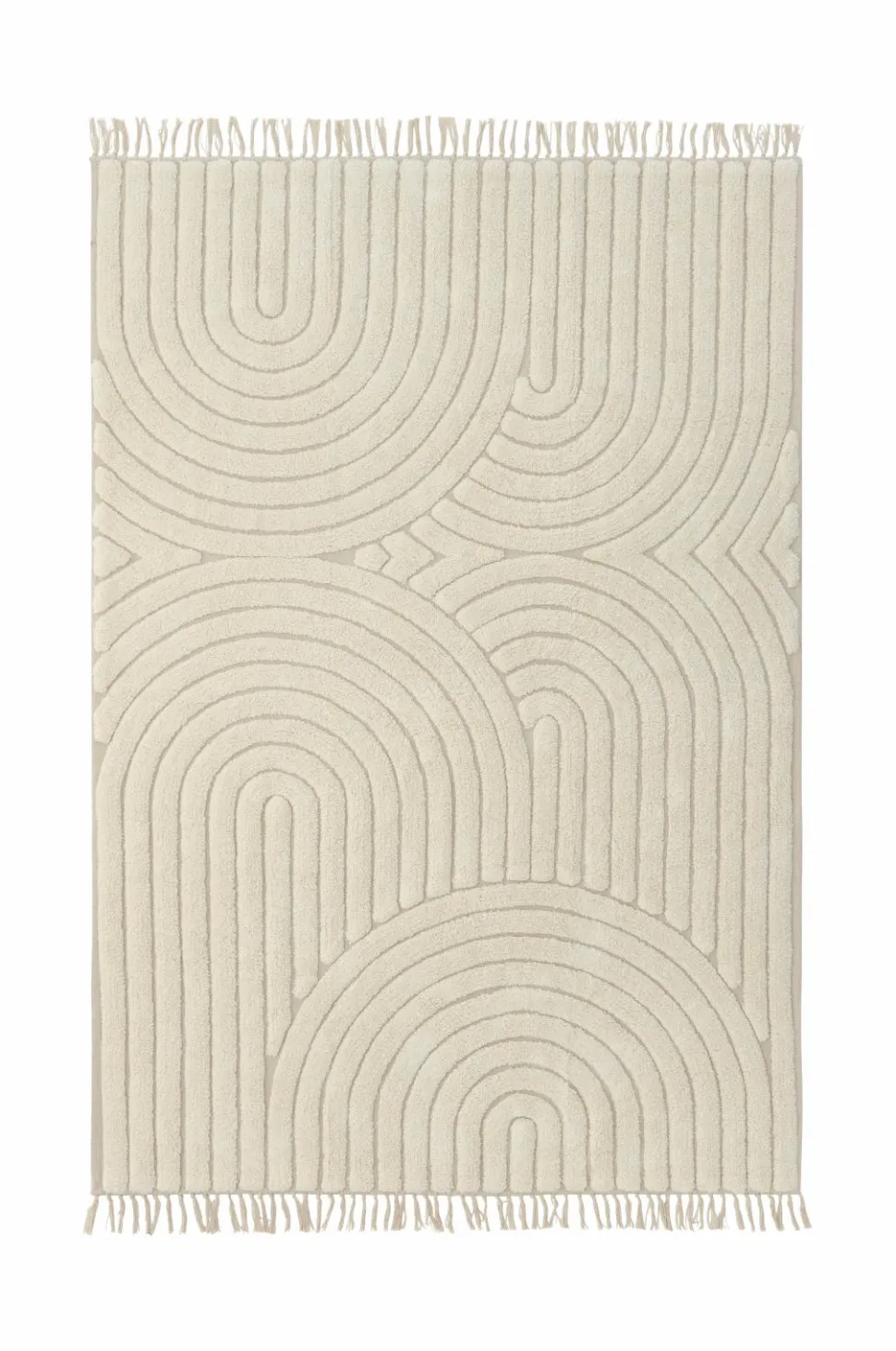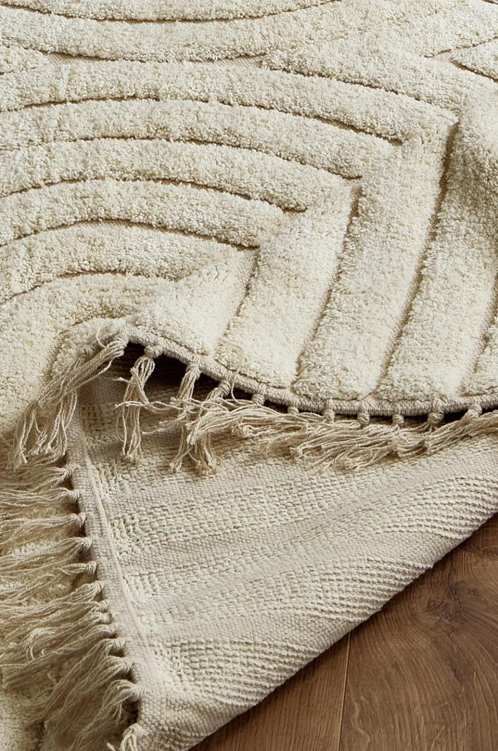 Håndvævet bomuldstæppe med tuftet mønster. Frynser i enderne.