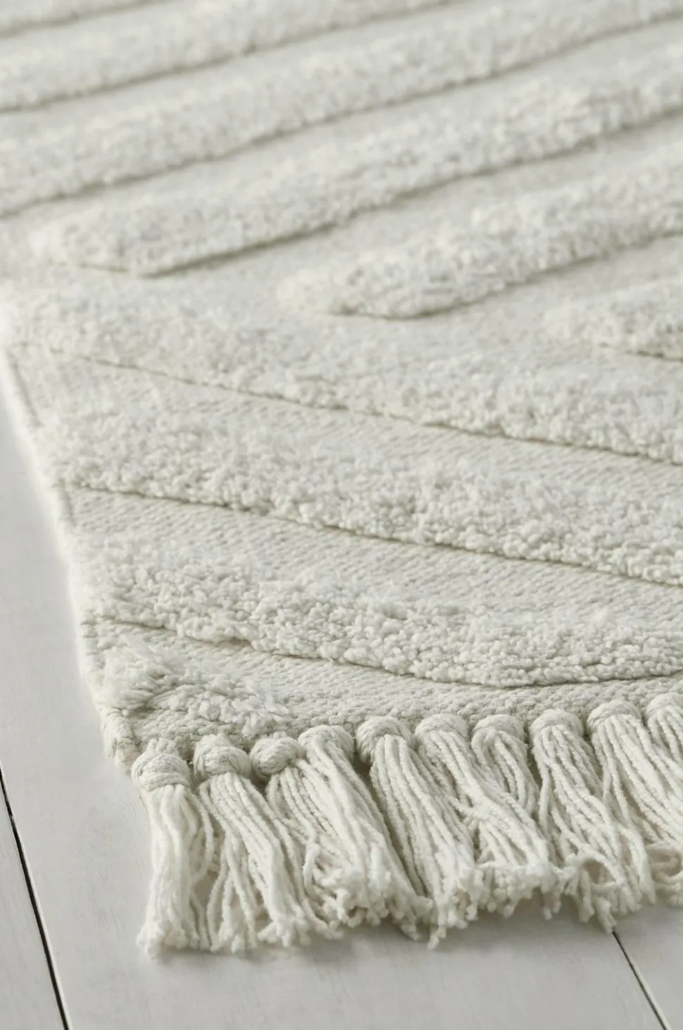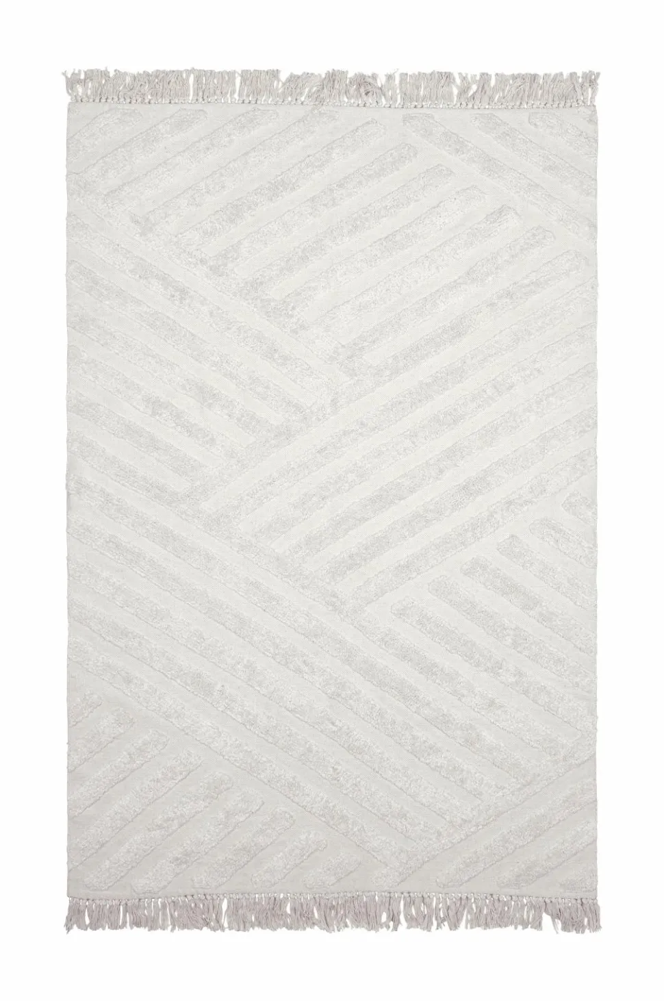 Bomuldstæppe Viterbo har en glat forside med et dekorativt, tuftet diagonalmønster. Frynser med knuder.