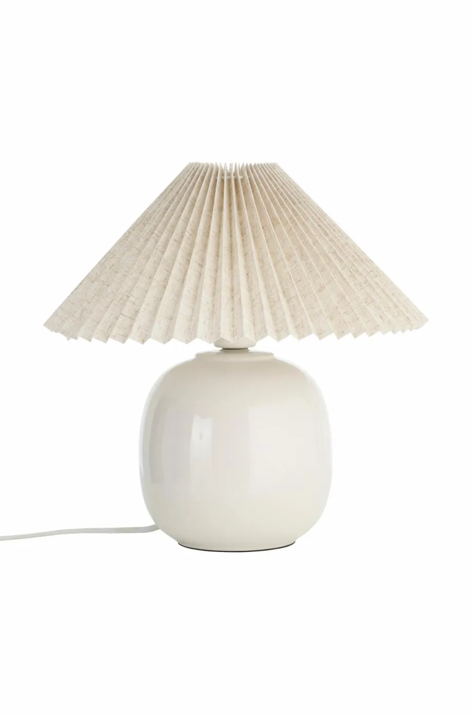Bordlampe med fod i glaseret keramik og plisseret skærm i hørstof.