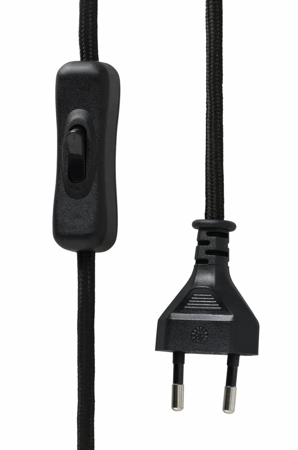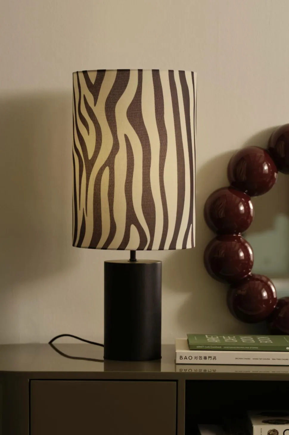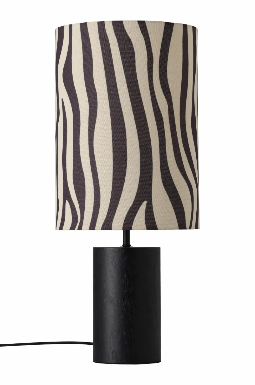 Bordlampe med tekstilskærm af grovere stof med printet mønster. Lampefod af træ med matsort, malet finish. Skærmens størrelse: Diameter 25 cm, højde 35 cm. Fodens mål: Diameter 12 cm, højde 20 cm. Sort stofledning med strømafbryder. Pære medfølger ikke.