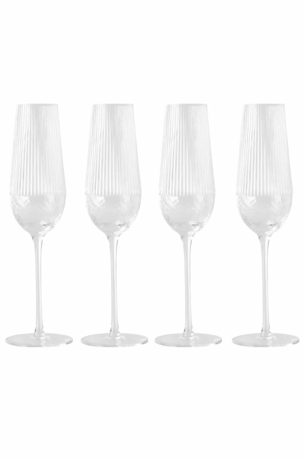 4 stk. champagneglas. Højde 24,5 cm. Diameter foroven 4 cm. Diameter fod 7 cm. Volumen: 260 ml. Tåler opvaskemaskine men ikke mikrobølgeovn.