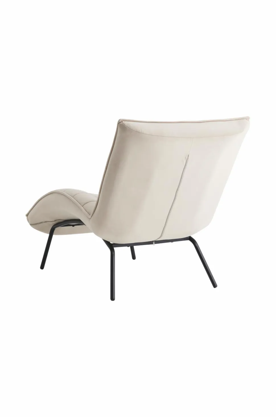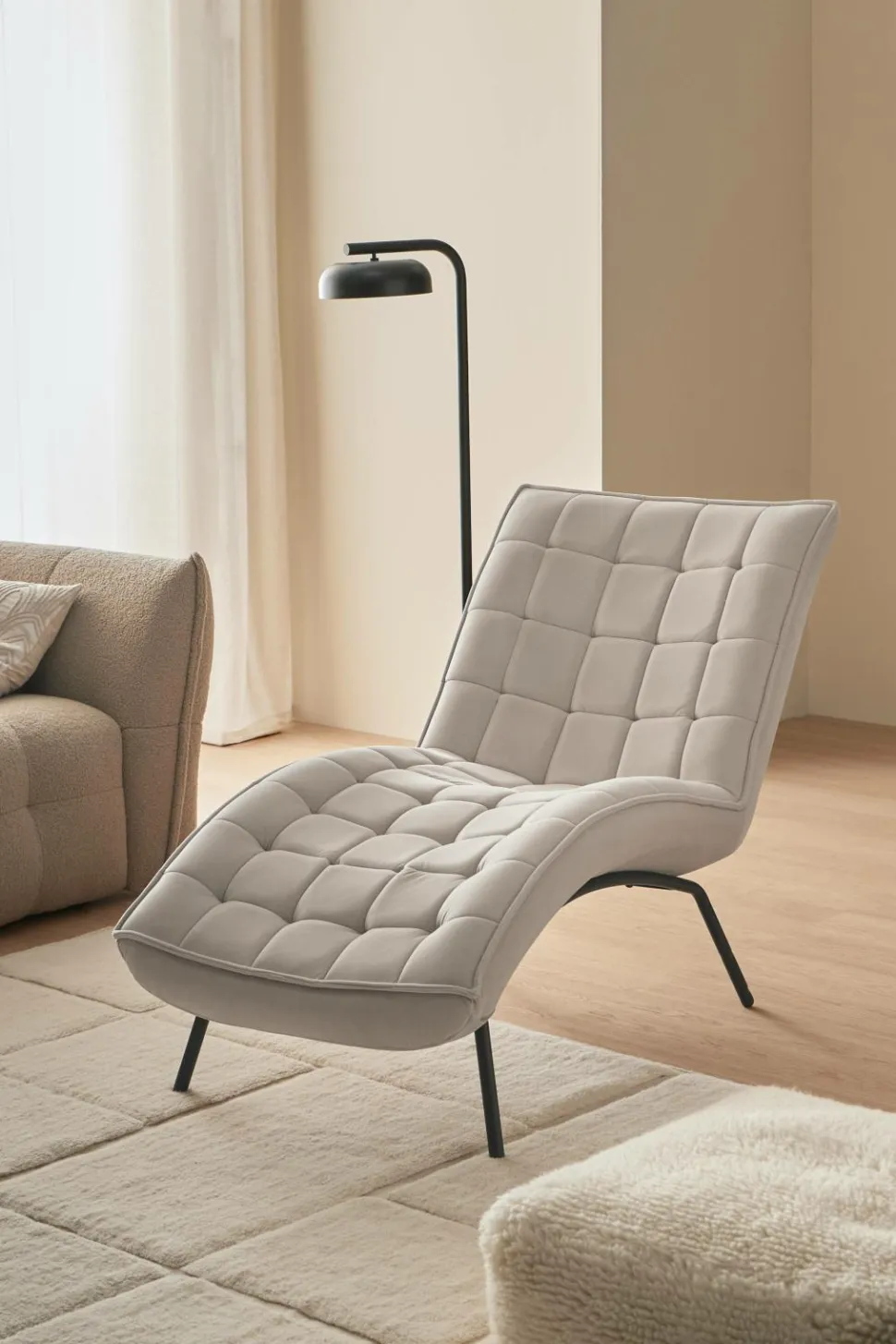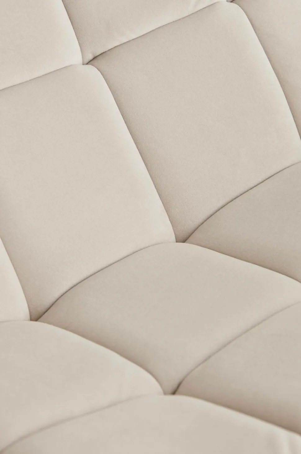 Daybed med paspoleret kant rundt om. Betræk i velour af polyester med indfældninger, der danner et dekorativt ternet mønster. Skumfyld. Ben af metal.
