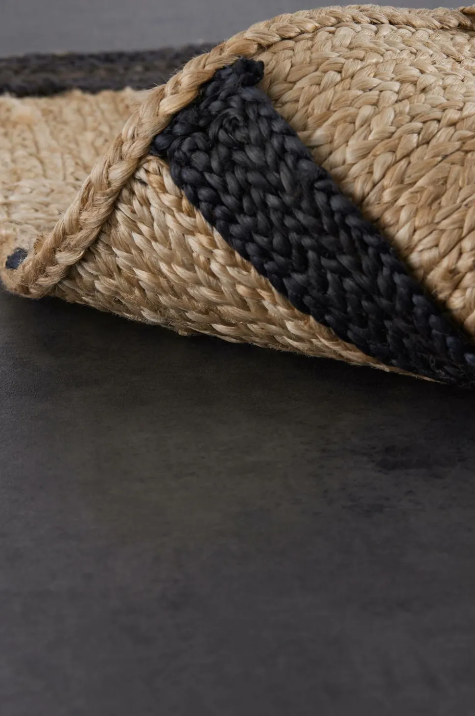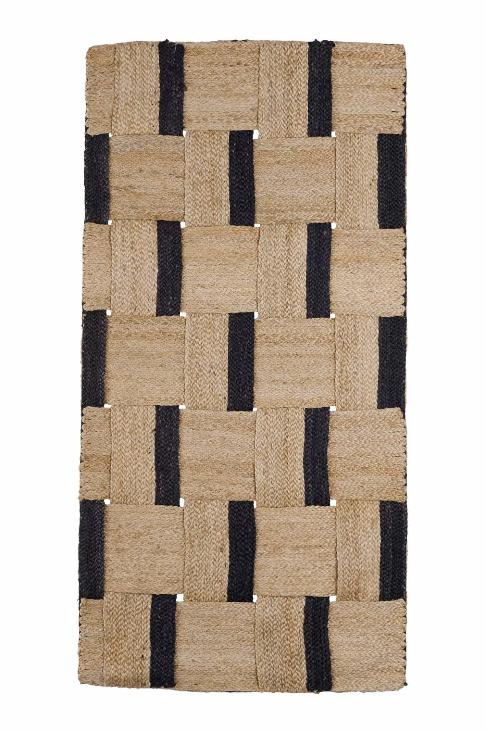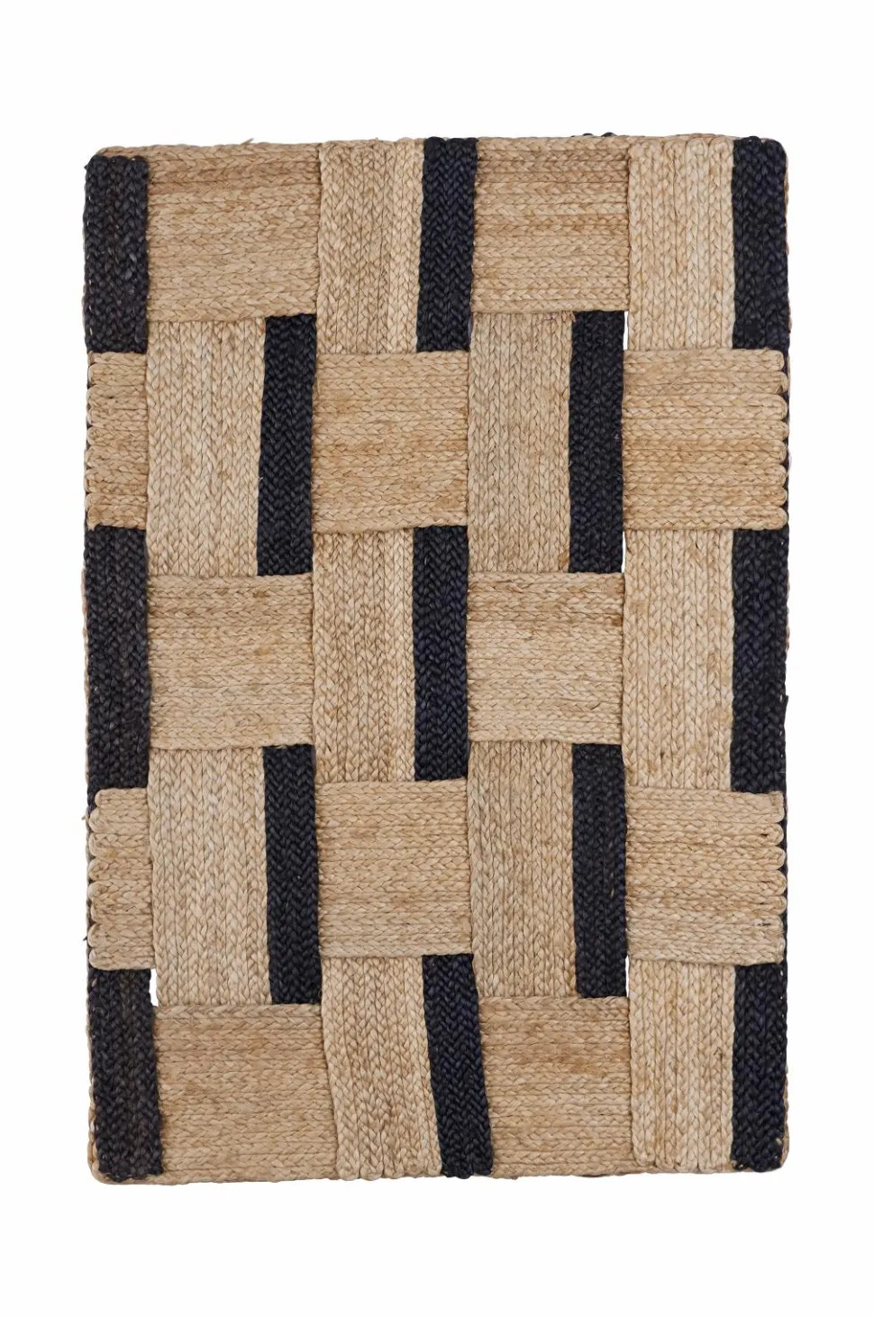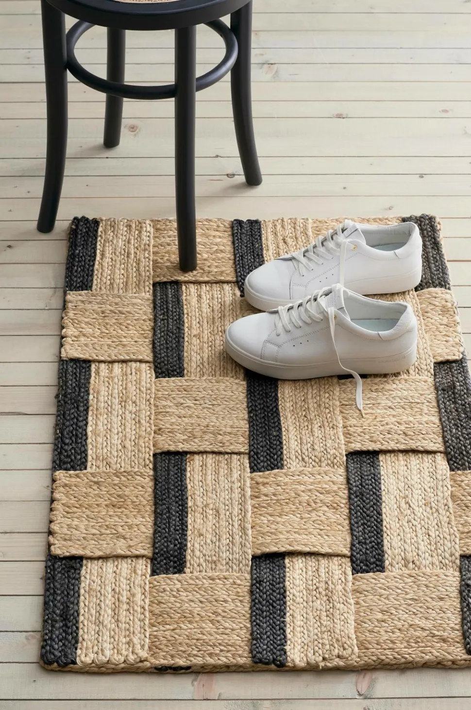 Dørmåtte af flettet, grov jute som er lagt i mønster.