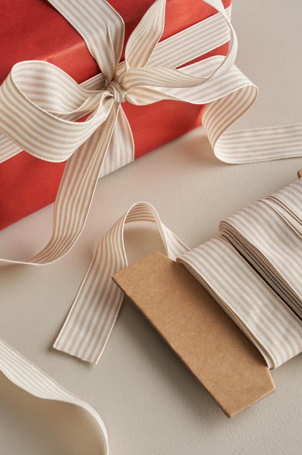 Stribevævet gavebånd af 100% polyester. Bredde 25 mm, længde 20 m.