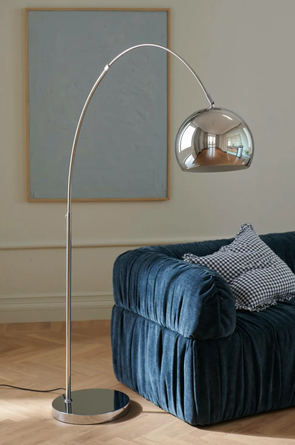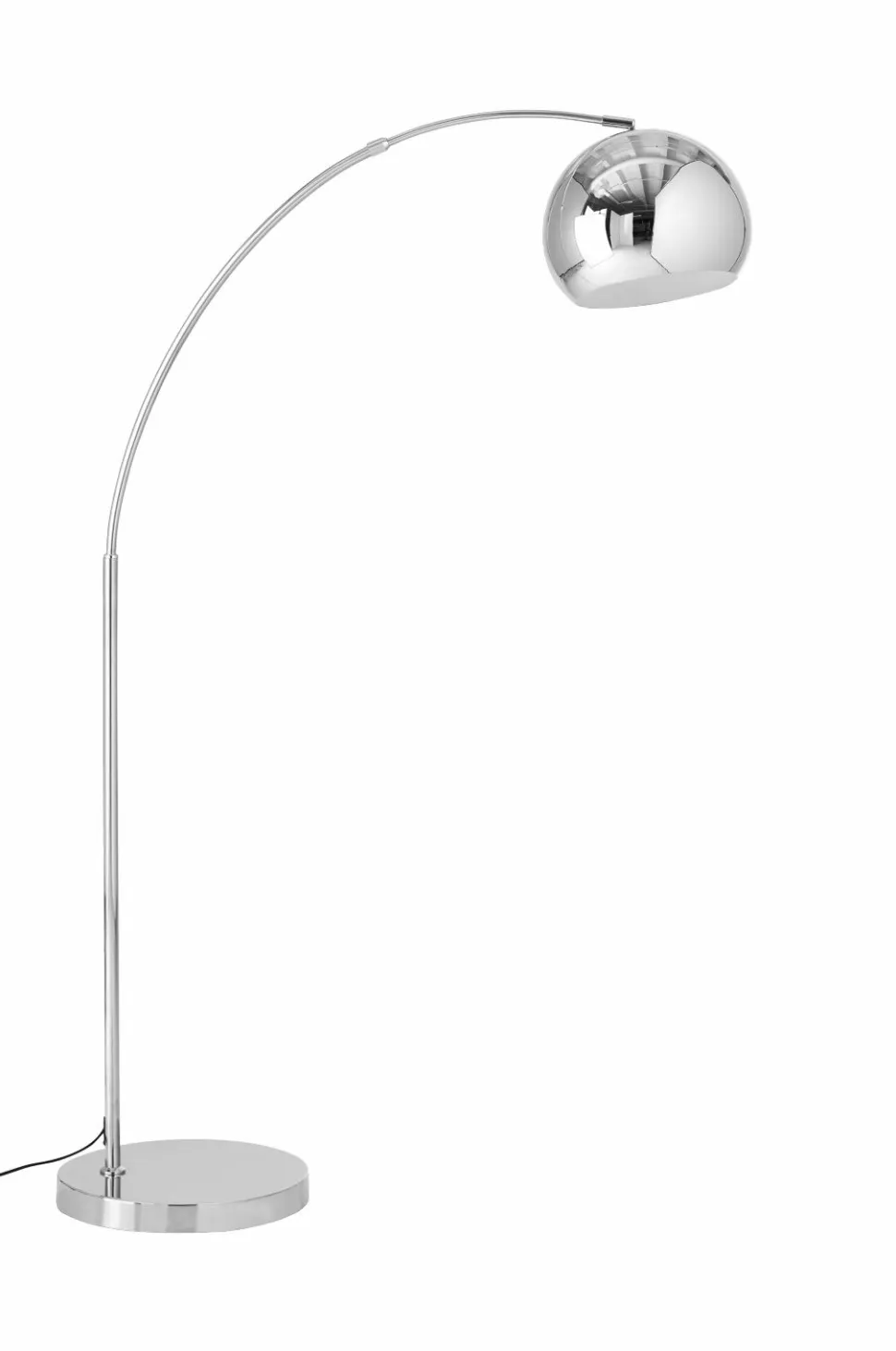 Gulvlampe i metal med blank finish. Den øverste arm kan justeres i ønsket længde og skærmen med justeres i højden. Lampens mål: Maks. højde 160 cm og dybde ca. 65-115 cm. Skærmens mål: Diameter 27 cm, højde 20,5 cm. Gulvpladens mål: Diameter er 35 cm, højde 4 cm. Sort stofledning med fodafbryder og stik. Ledningslængde 250 cm. Sokkel E27. Maks. 25 W. Pære medfølger ikke.