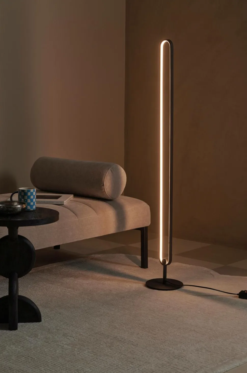 Gulvlampe i minimalistisk design af metal i mat finish. Lampen er enkel og stringent i stilen. Integreret LED-belysning (kan ikke udskiftes) og indbygget dæmper. Strømafbryder med dæmperfunktion. Sort PVC-ledning. Forventet levetid: 36.000 timer.