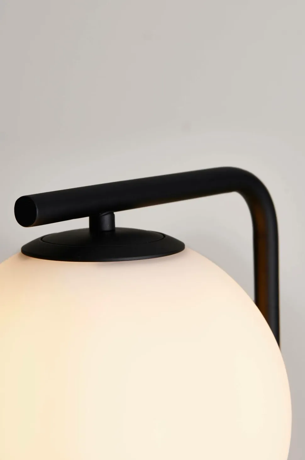 Gulvlampe af metal. Kuppel i opalhvidt glas, diameter 20 cm. Kuplen fastgøres og løsnes med skruefunktion. Bundplade mål: Diameter 25 cm, højde 1,5 cm. Sort plastledning med fodafbryder.