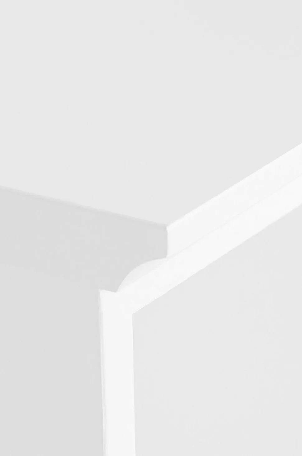 Hylde med fire rum. Fremstillet af malet MDF, rummenes indvendige mål: højde 34 cm, bredde 35 cm.