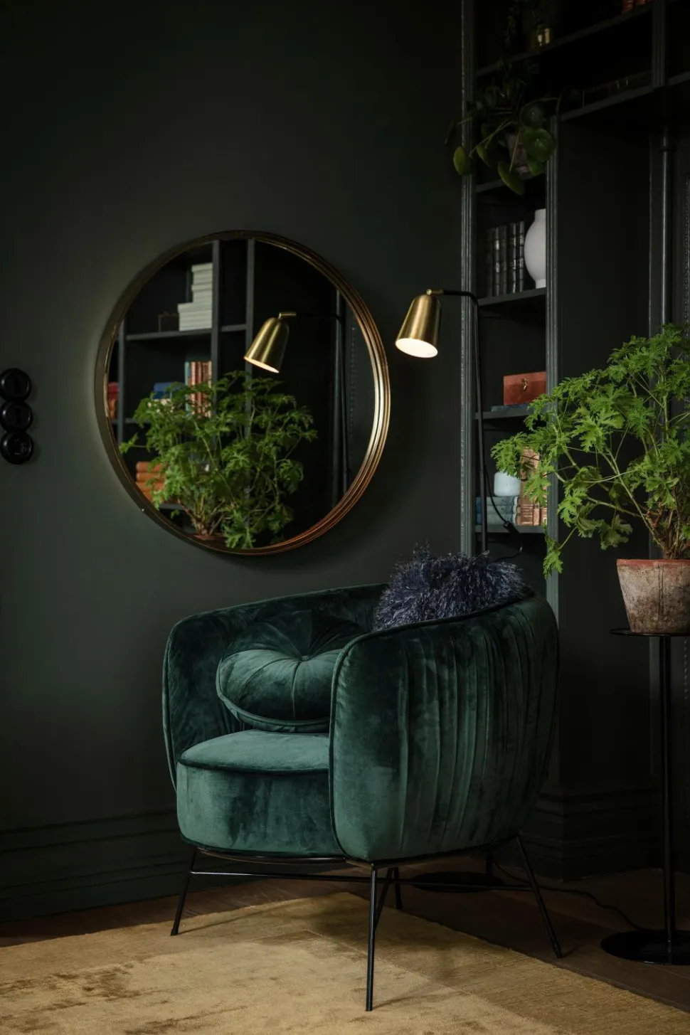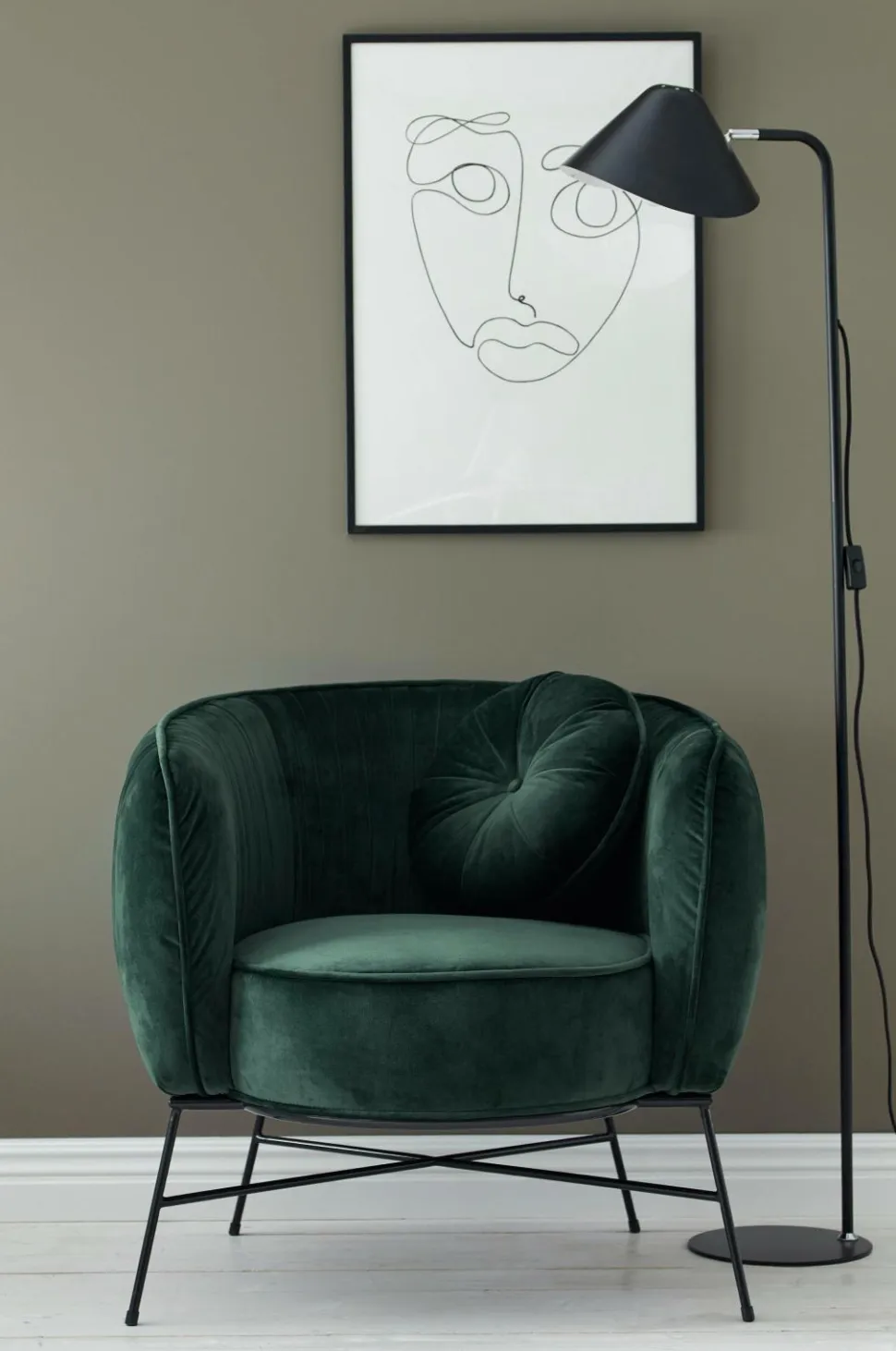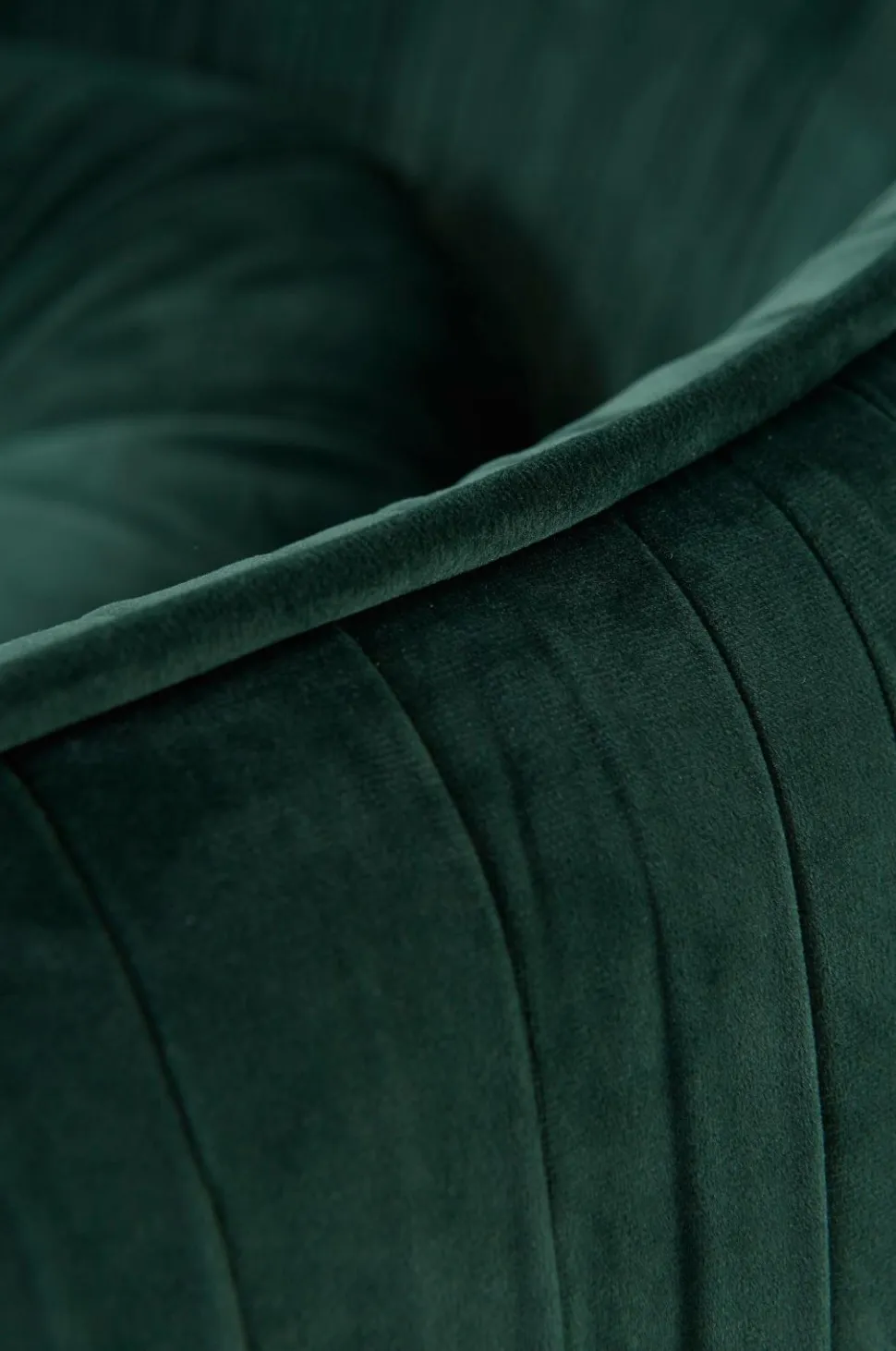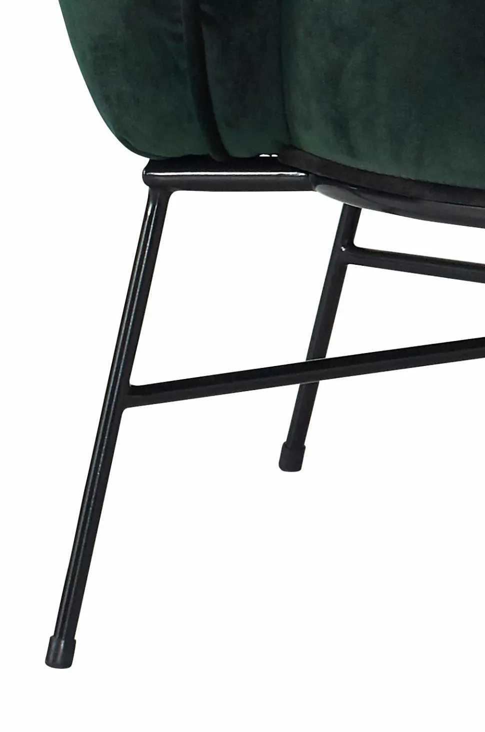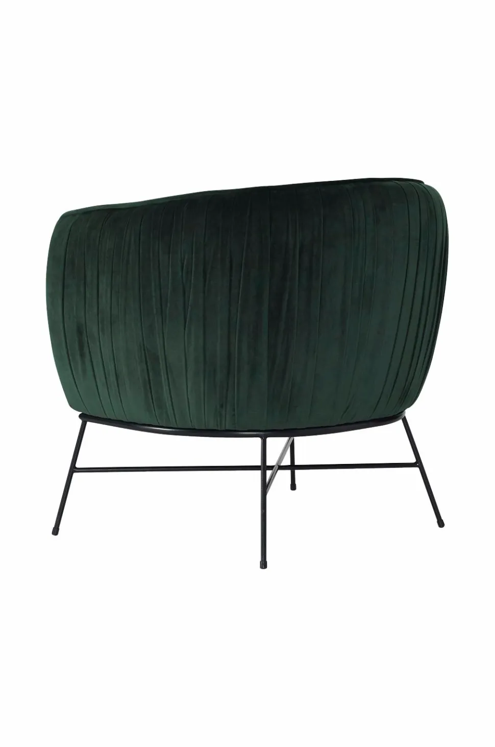 Lænestol med betræk i velour. Overdel med rynket stof på både yder- og indersiden. Pyntepude i velour med beklædt knap medfølger. Træstel. Understel og ben af pulverlakeret metal. Polstring af polyether.