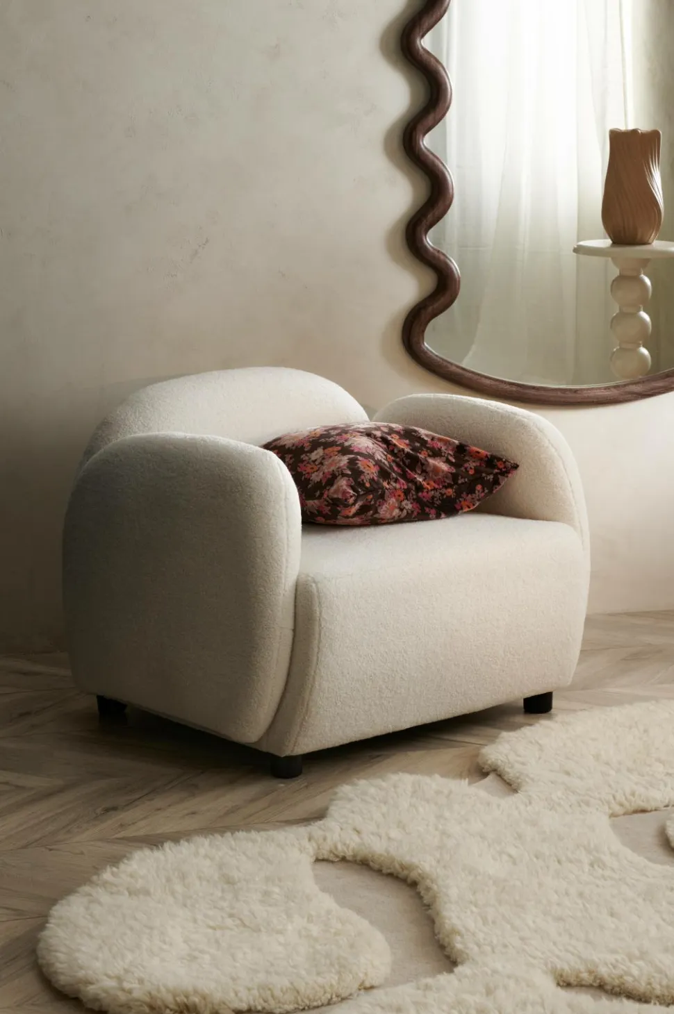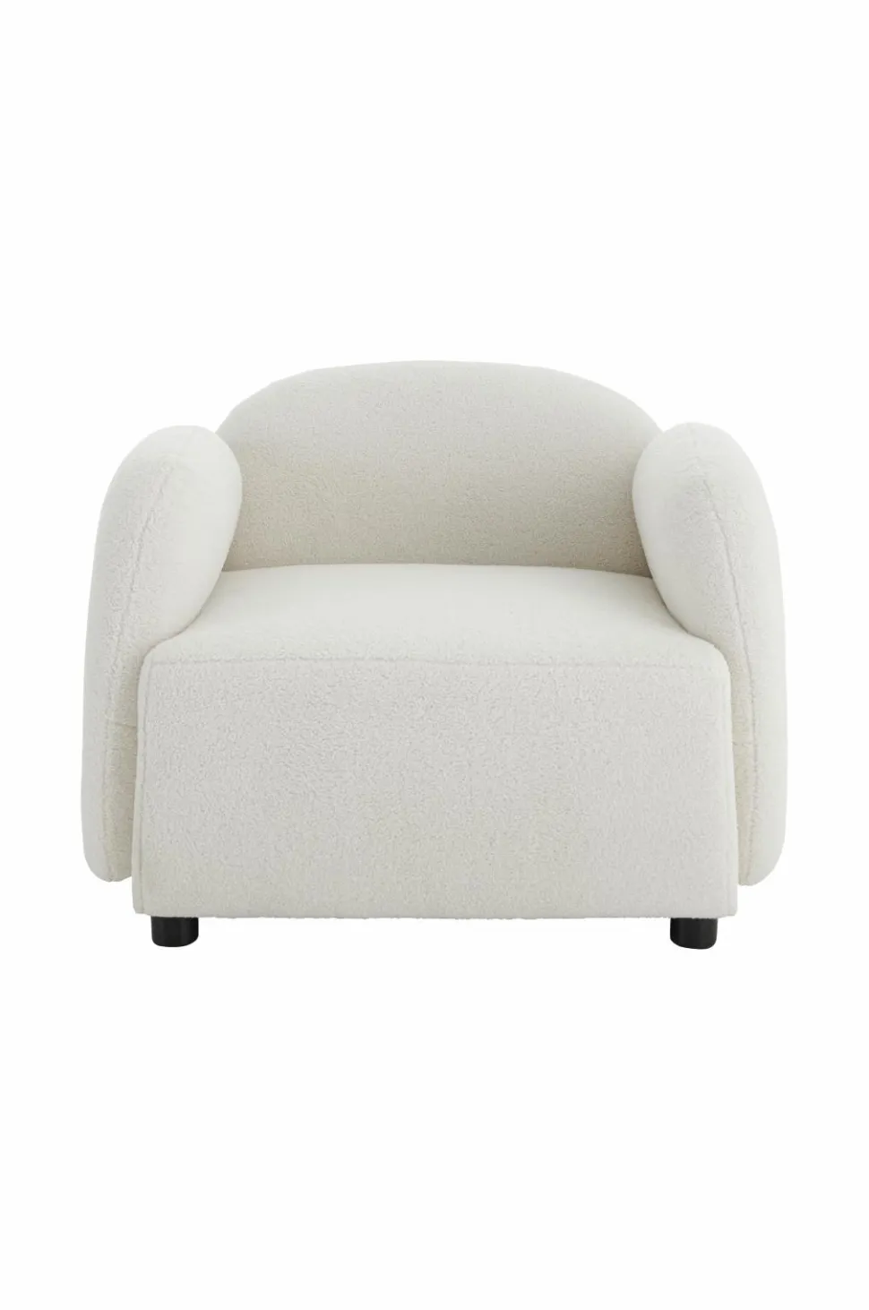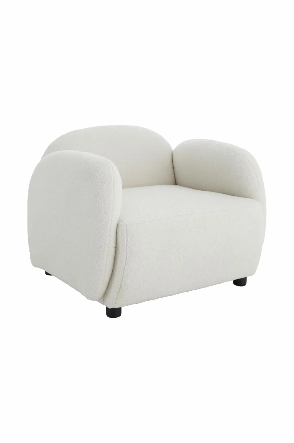 Lænestol med blødt betræk i plys. Stel af poppeltræ. Skumfyld. Ben af plast. Maks. belastning 150 kg. Frihøjde under møbel 5 cm.