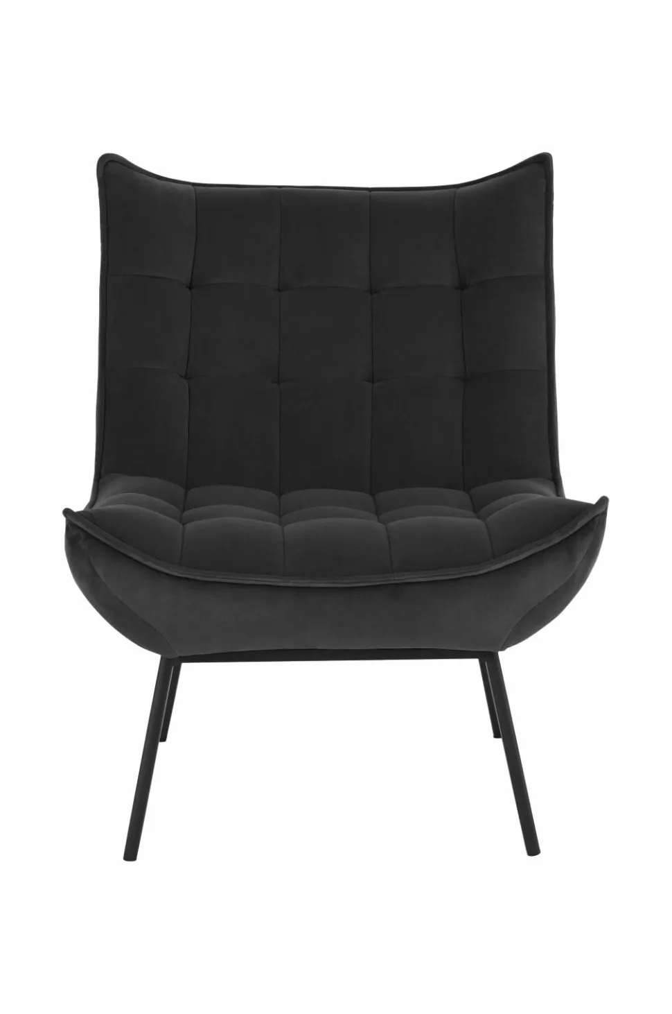 Lænestol med paspoleret kant rundt om. Indfældninger, der danner et dekorativt ternet mønster. Skumfyld. Ben af metal. Lettere samling.