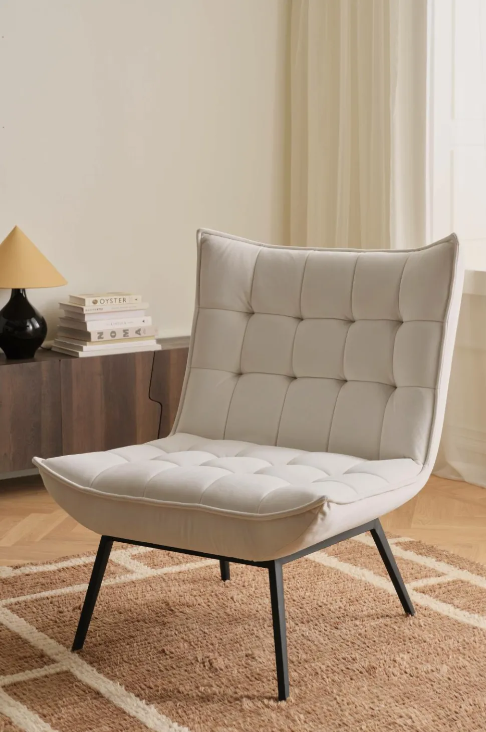 Lænestol med paspoleret kant rundt om. Indfældninger, der danner et dekorativt ternet mønster. Skumfyld. Ben af metal. Lettere samling.