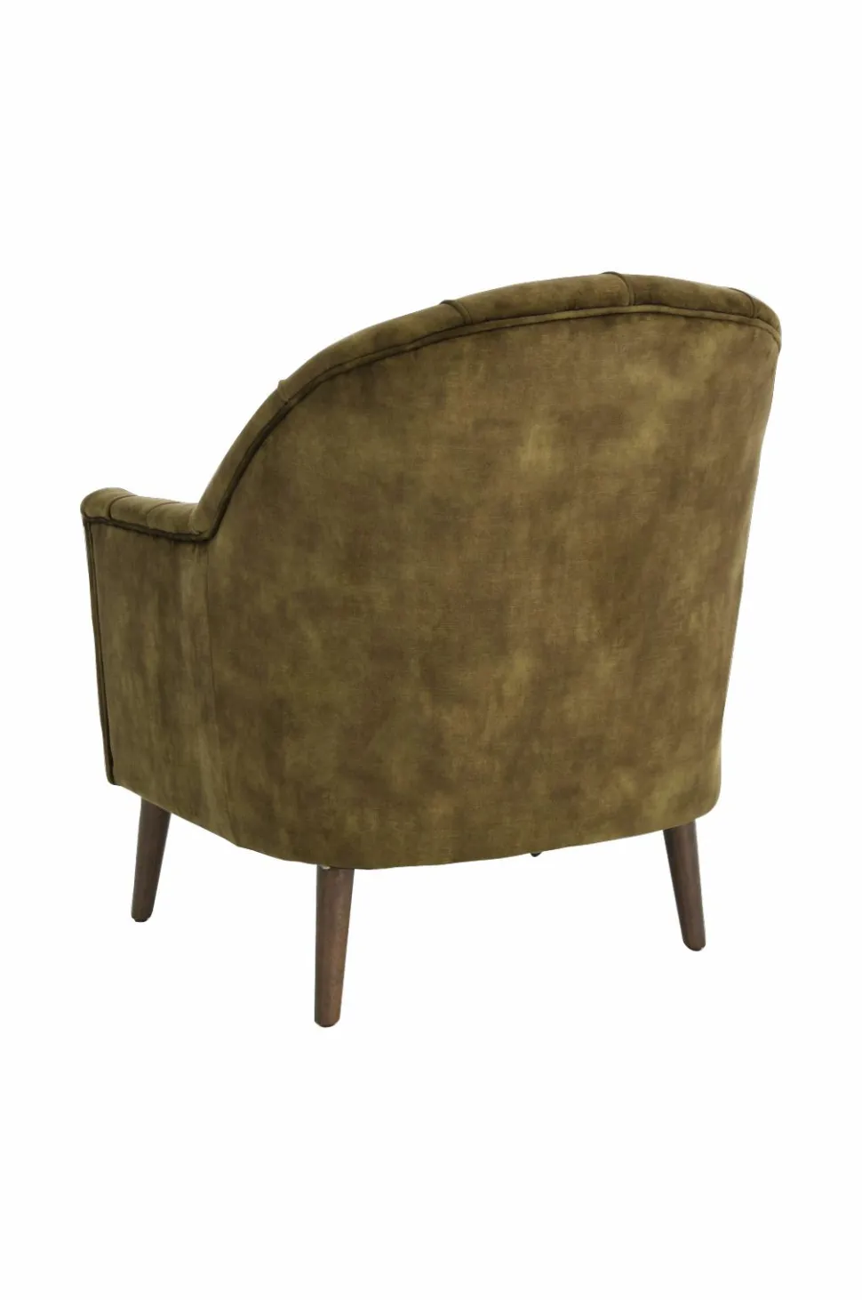 Lænestol med ben og stel i gummitræ. Betræk i meleret velour med smuk glans. Knapper på indersiden. Lettere samling.