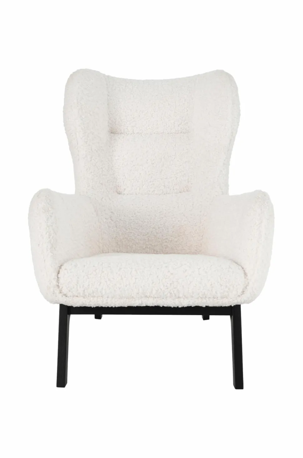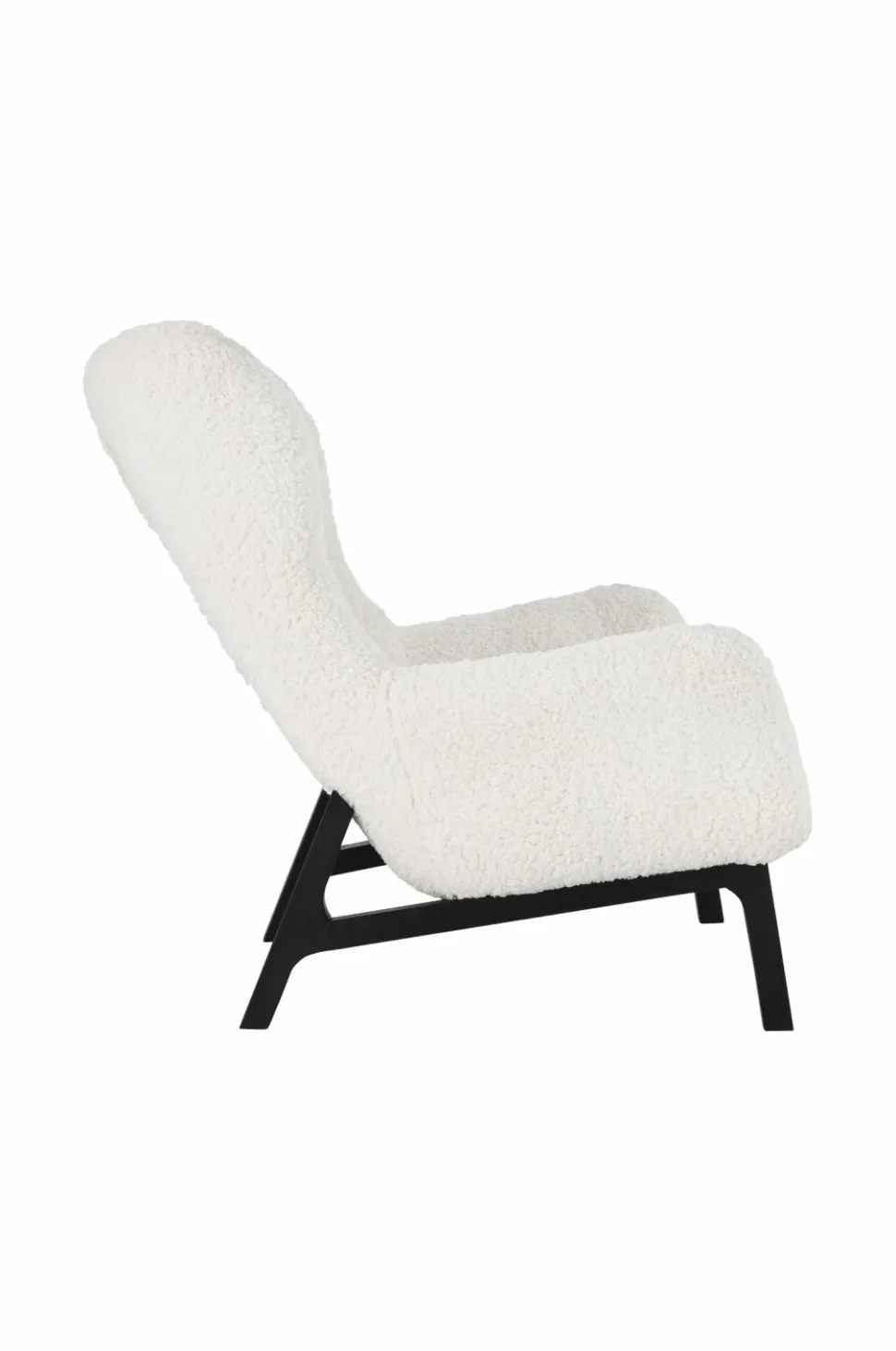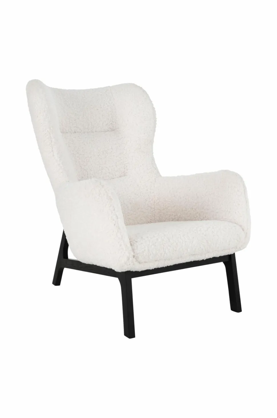 Lænestol med stel i massiv ask og yderstof i imiteret fåreskind af polyester.
