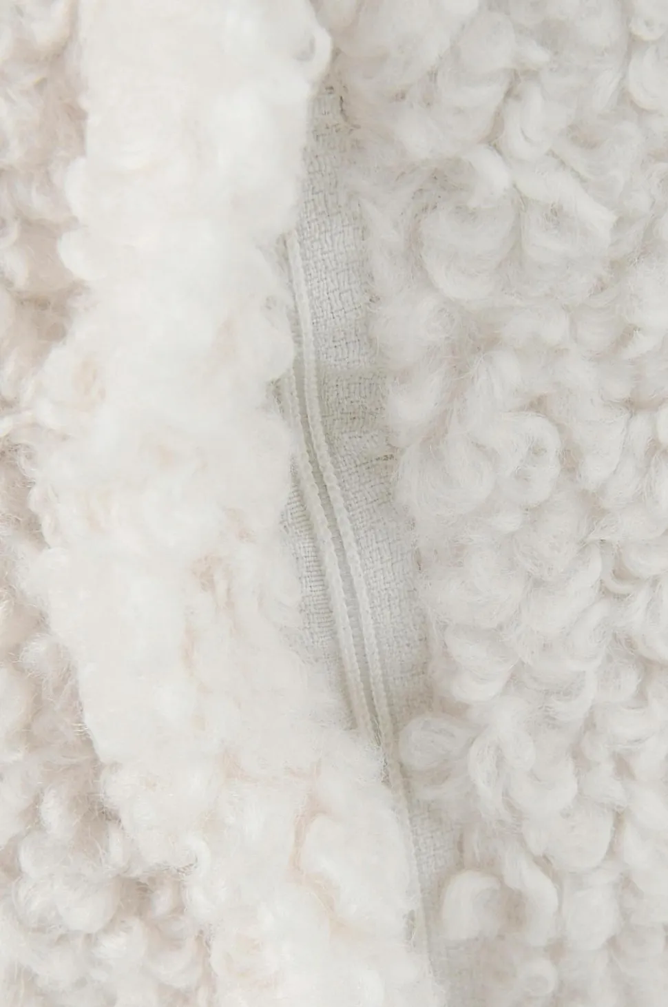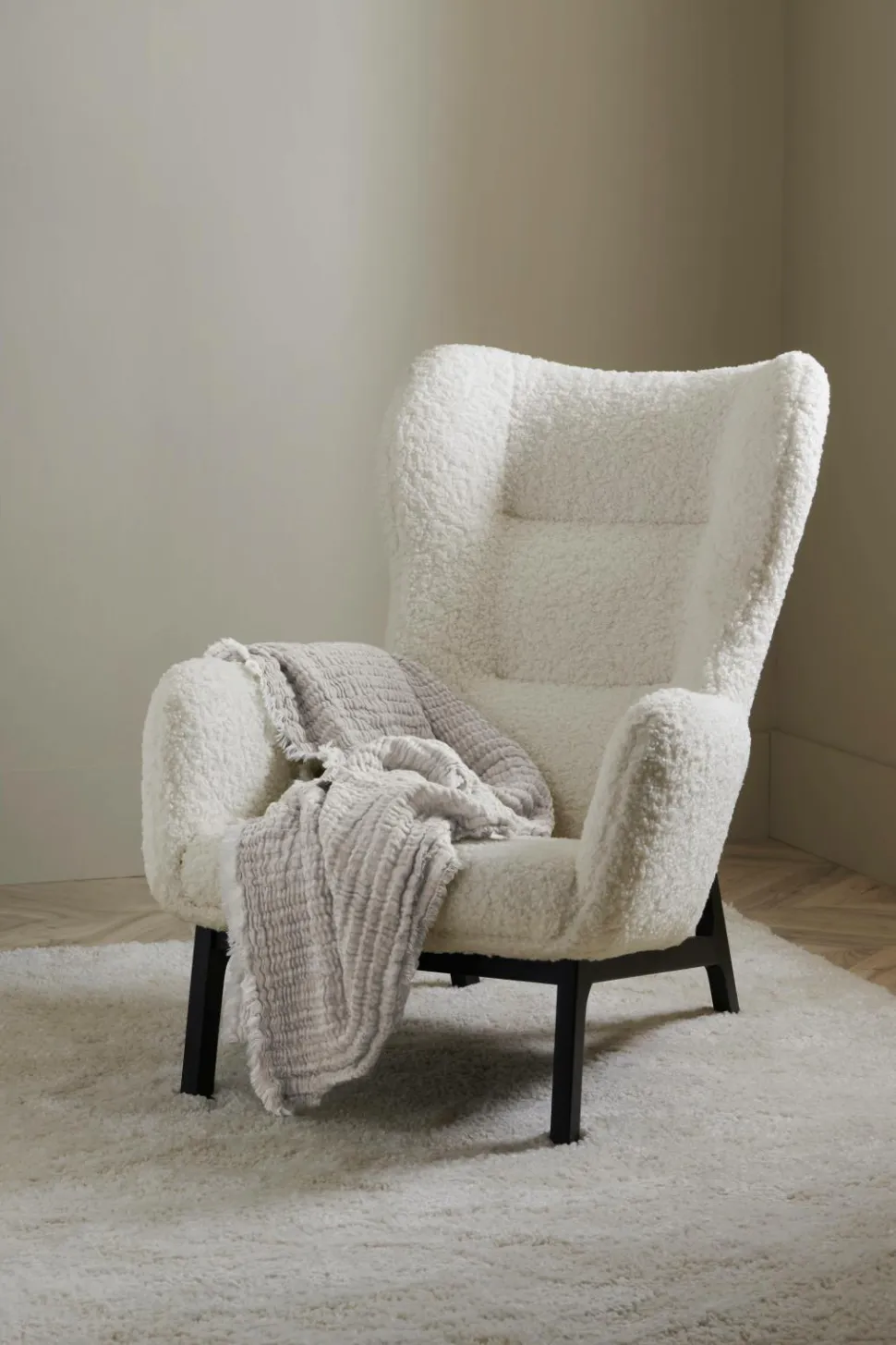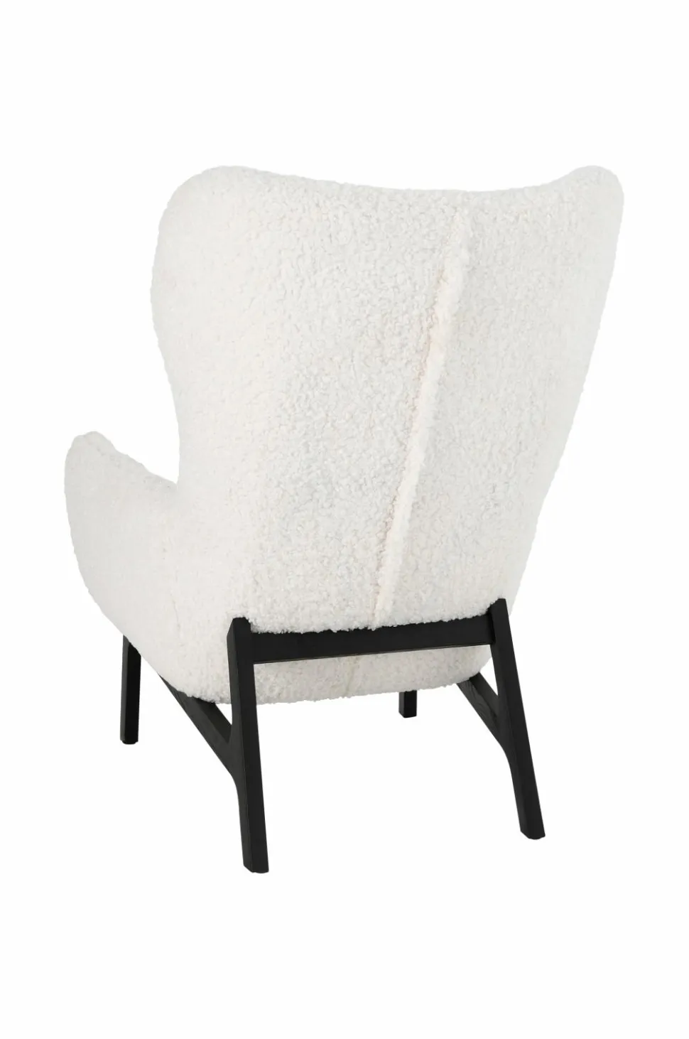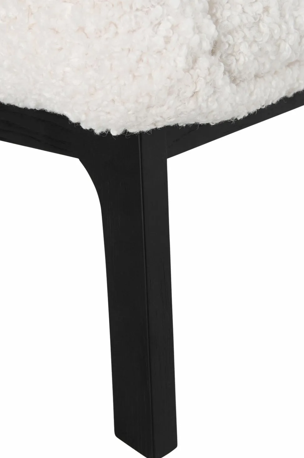 Lænestol med stel i massiv ask og yderstof i imiteret fåreskind af polyester.