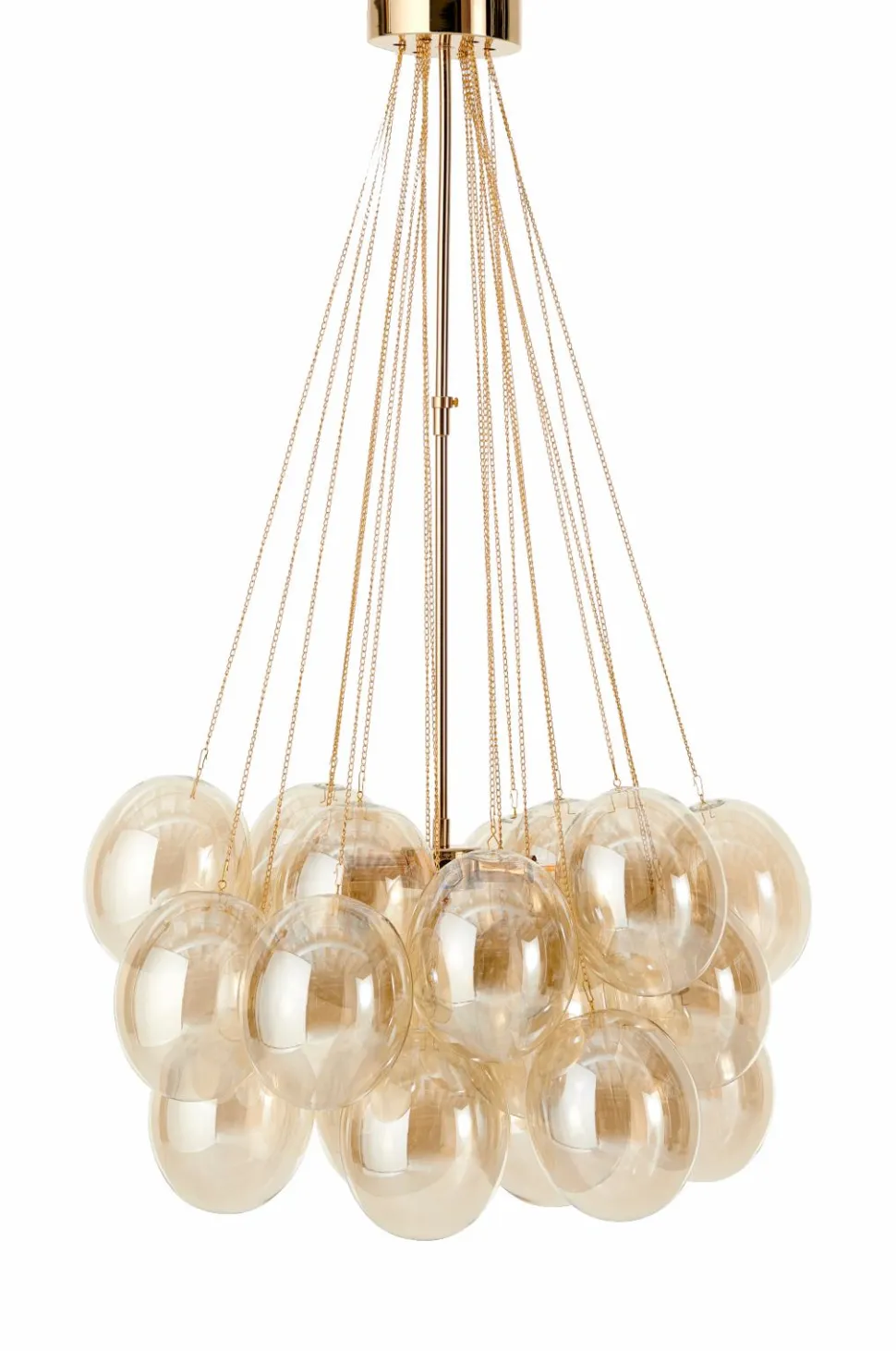 En loftlampe som består af en stel af metal med 5 lyskilder. Et bundt af 21 glaskupler, hver monteret i en kæde af varierende længde, som spreder lyset.