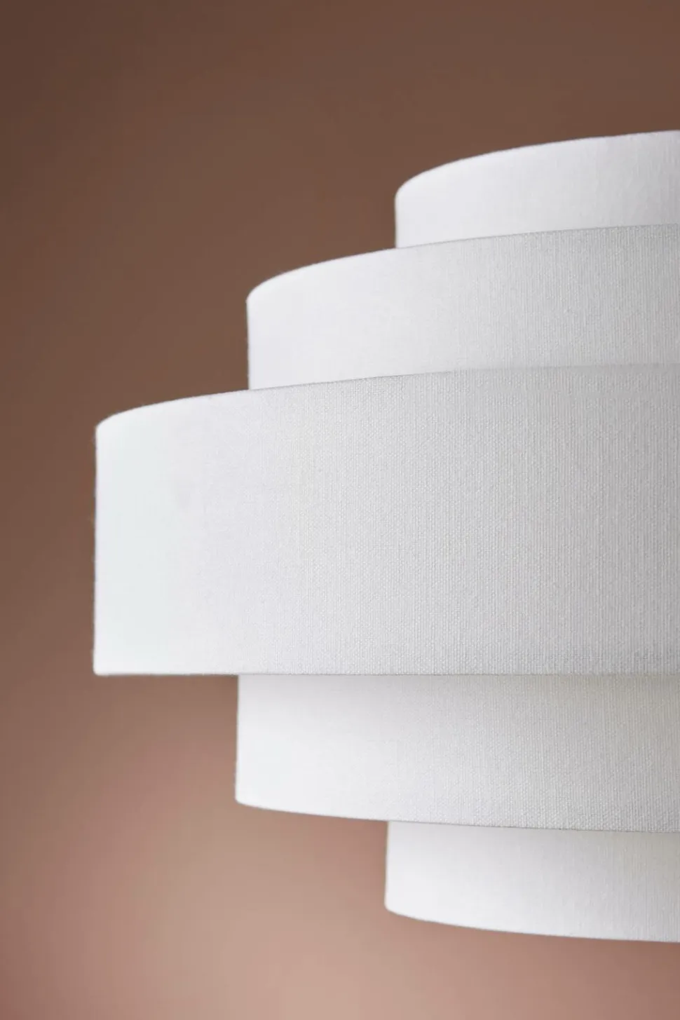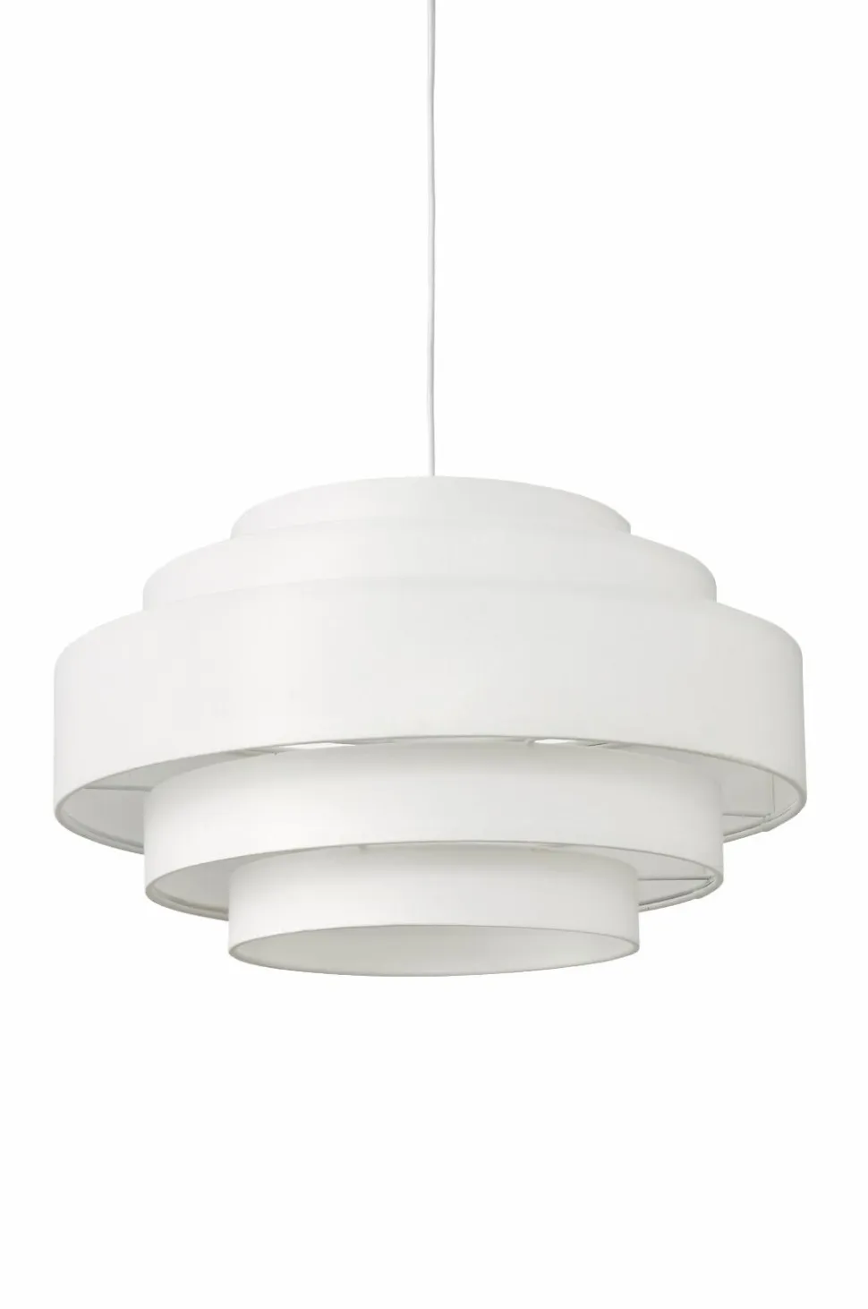 Loftlampe med skærm af bomuldstekstil i flere sektioner og forskellige størrelser. Baldakin af plast med øsken. Mål: Ø 50 cm, Totalhøjde: 150 cm hvoraf lampeskærmens højde er 29 cm. Stofledning, længde 120 cm. Stor sokkel E27. Maks. 5 W. Pære medfølger ikke.