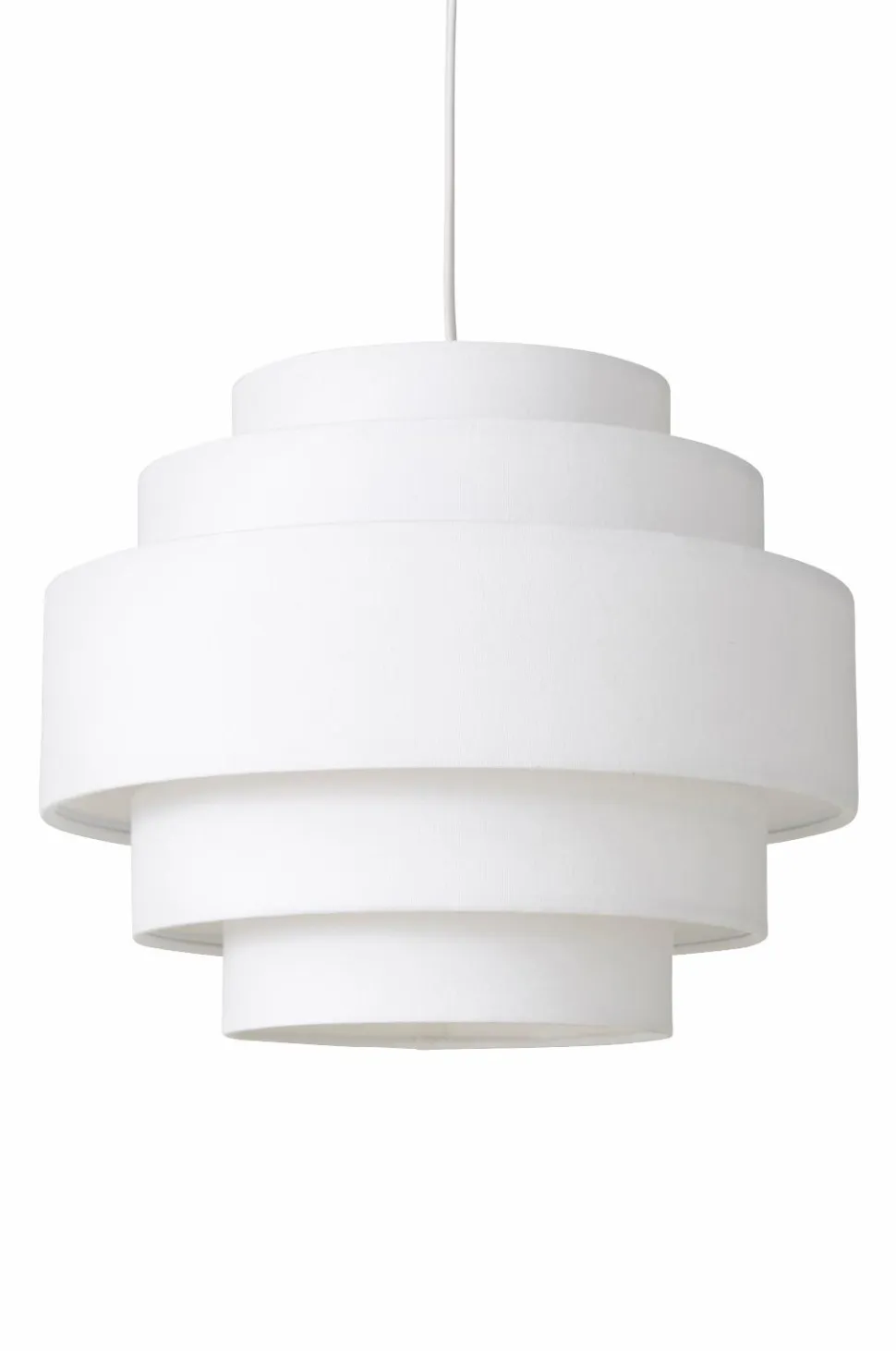 Loftlampe med skærm af tekstil i flere sektioner i forskellige størrelser, Ø ca. 35 cm. Højde 28 cm. Baldakin i plast med krogophæng og direkte kabelinstallation. Ledningslængde 120 cm.