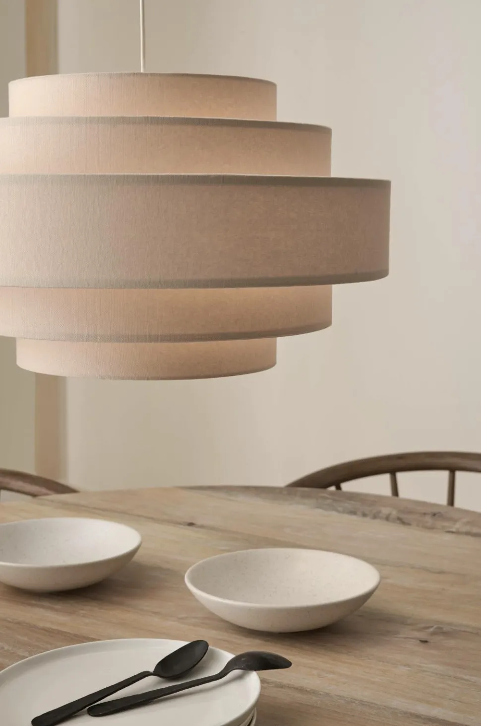 Loftlampe med skærm af bomuldstekstil i flere sektioner og forskellige størrelser. Baldakin af plast med øsken. Mål: Ø 50 cm, Totalhøjde: 150 cm hvoraf lampeskærmens højde er 29 cm. Stofledning, længde 120 cm. Stor sokkel E27. Maks. 5 W. Pære medfølger ikke.