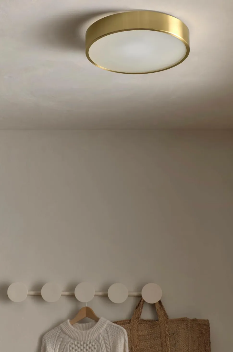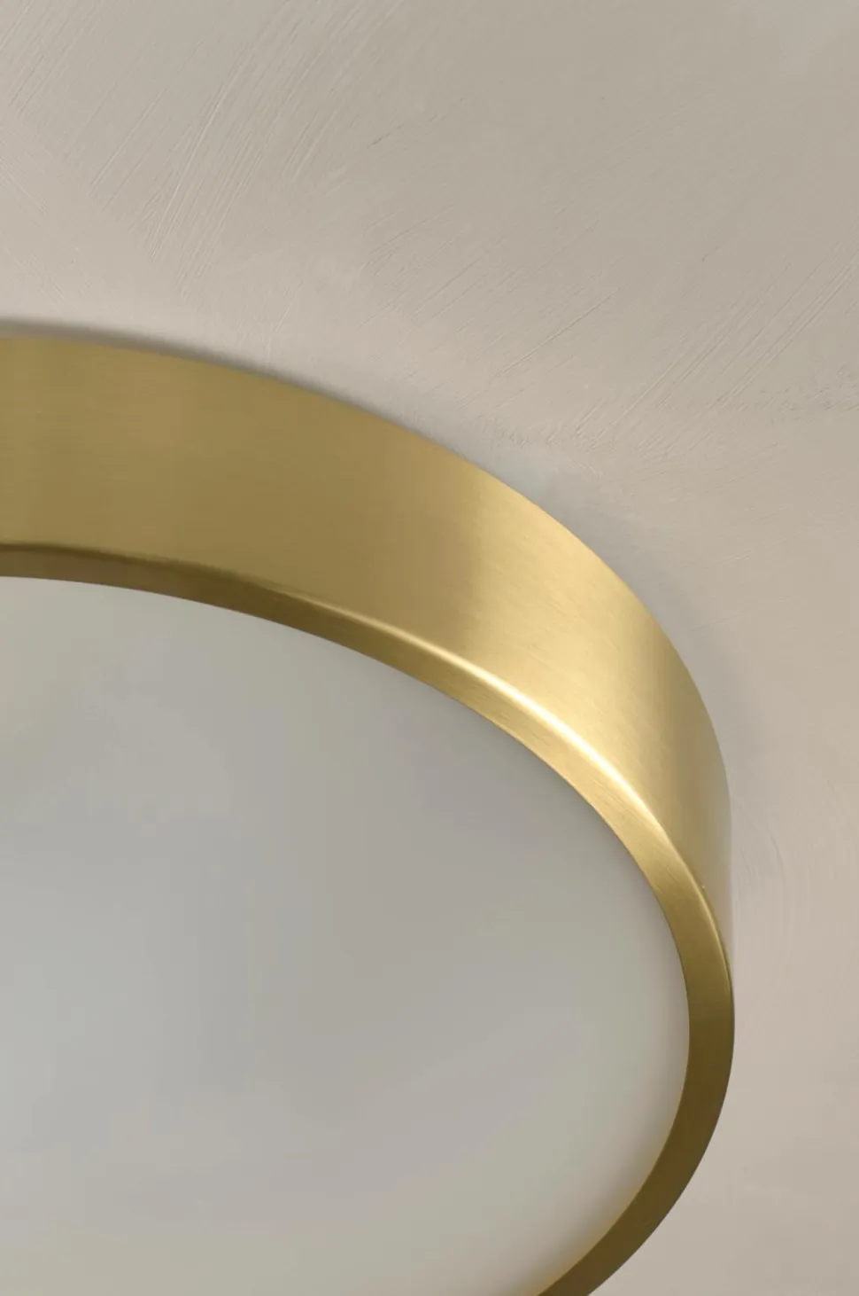 Loftplafond af metal med børstet finish og plade i matteret glas. Ø 40 cm. Højde 7 cm. Lille fatning 3xE14. Maks. 40 W.