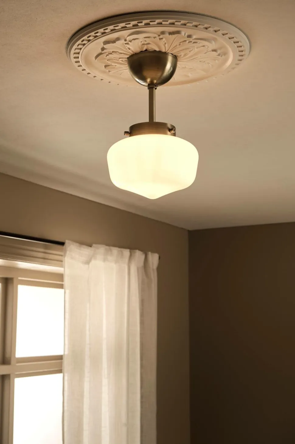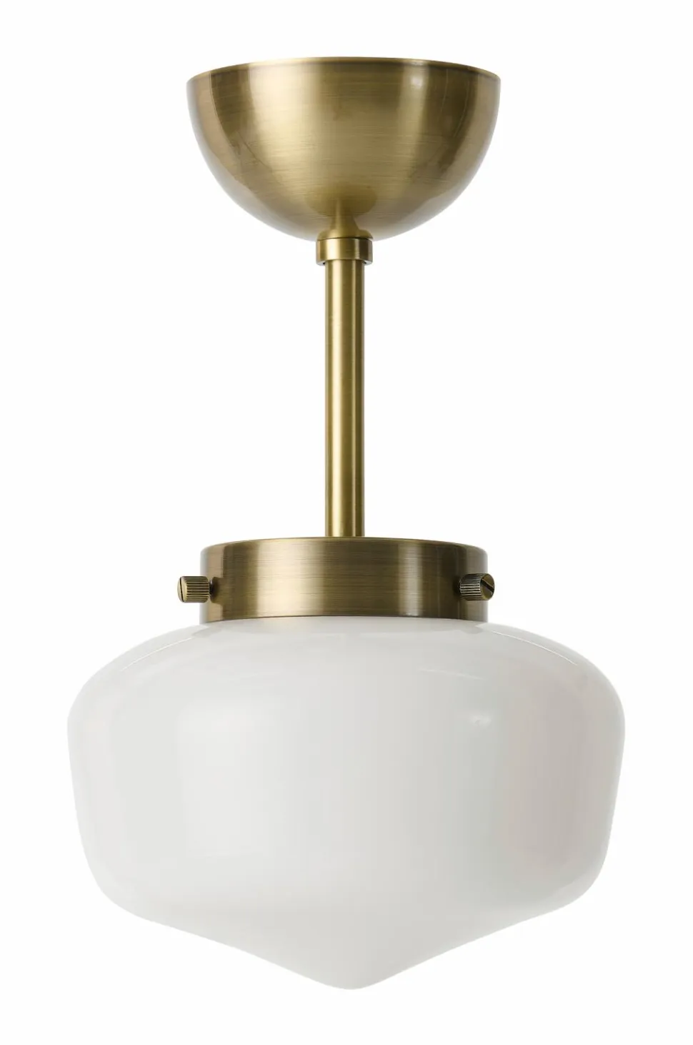 • Loftplafond i glinsende, opalhvid glas med detalje i messingfarvet metal