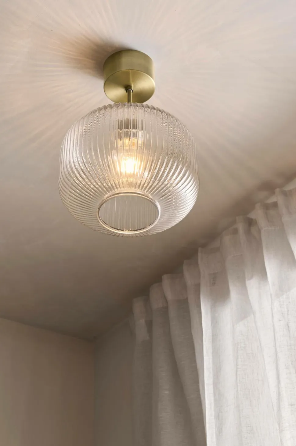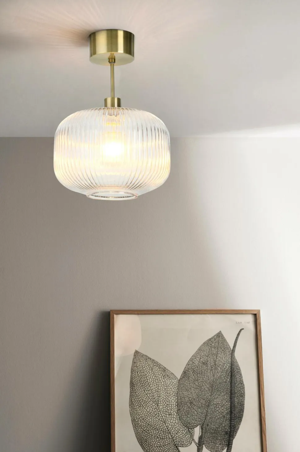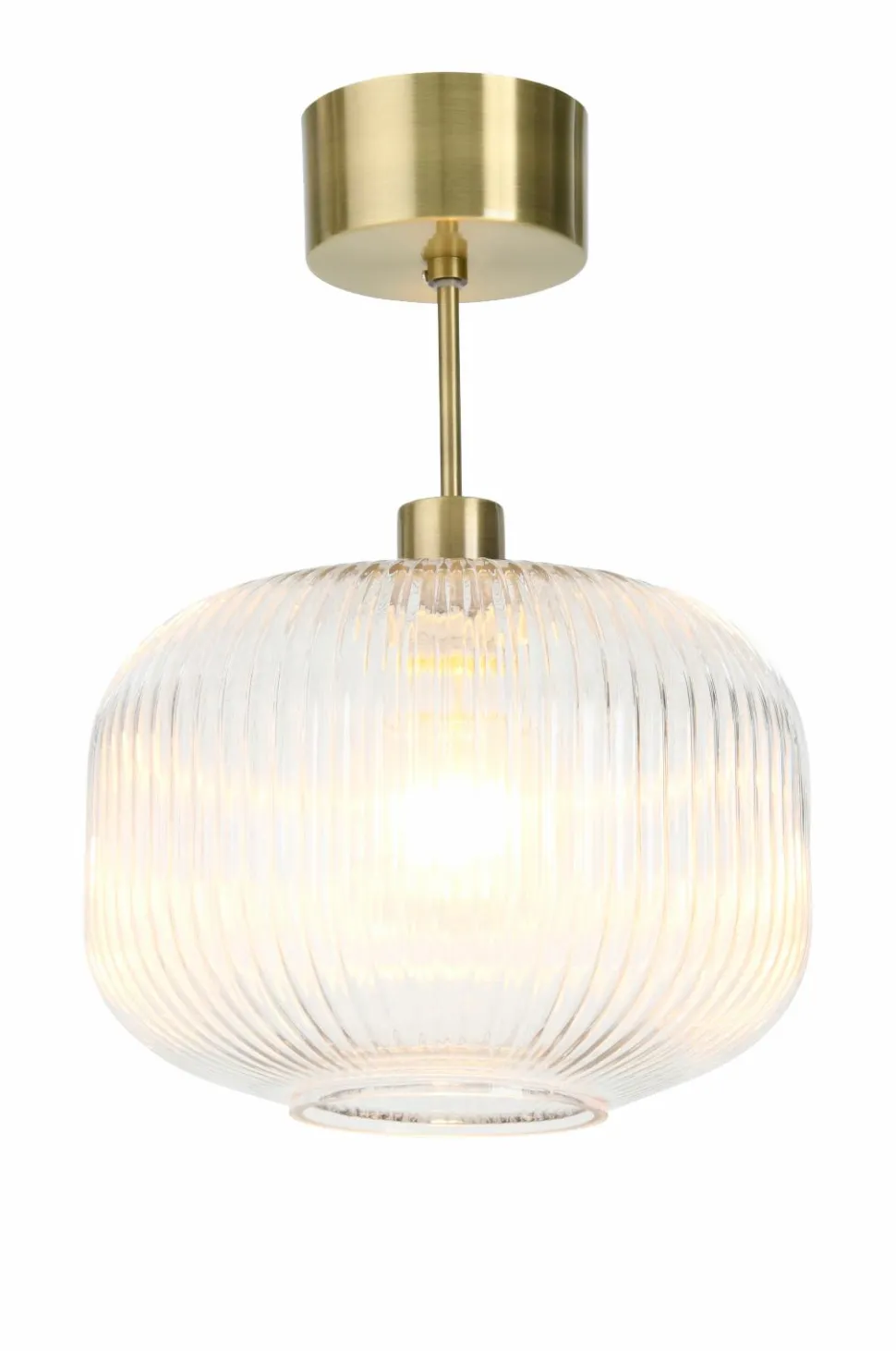 Loftlampe med afrundet glaskuppel med ribstruktur. Loftbeslag og detaljer i metal. Lampens samlede højde inklusive loftophæng ca. 45 cm. Mål på glaskuppel: Diameter 30 cm, højde 23 cm. Baldakin med krogophæng. Stor sokkel E27. Pære maks. 40 W. Pære medfølger ikke.