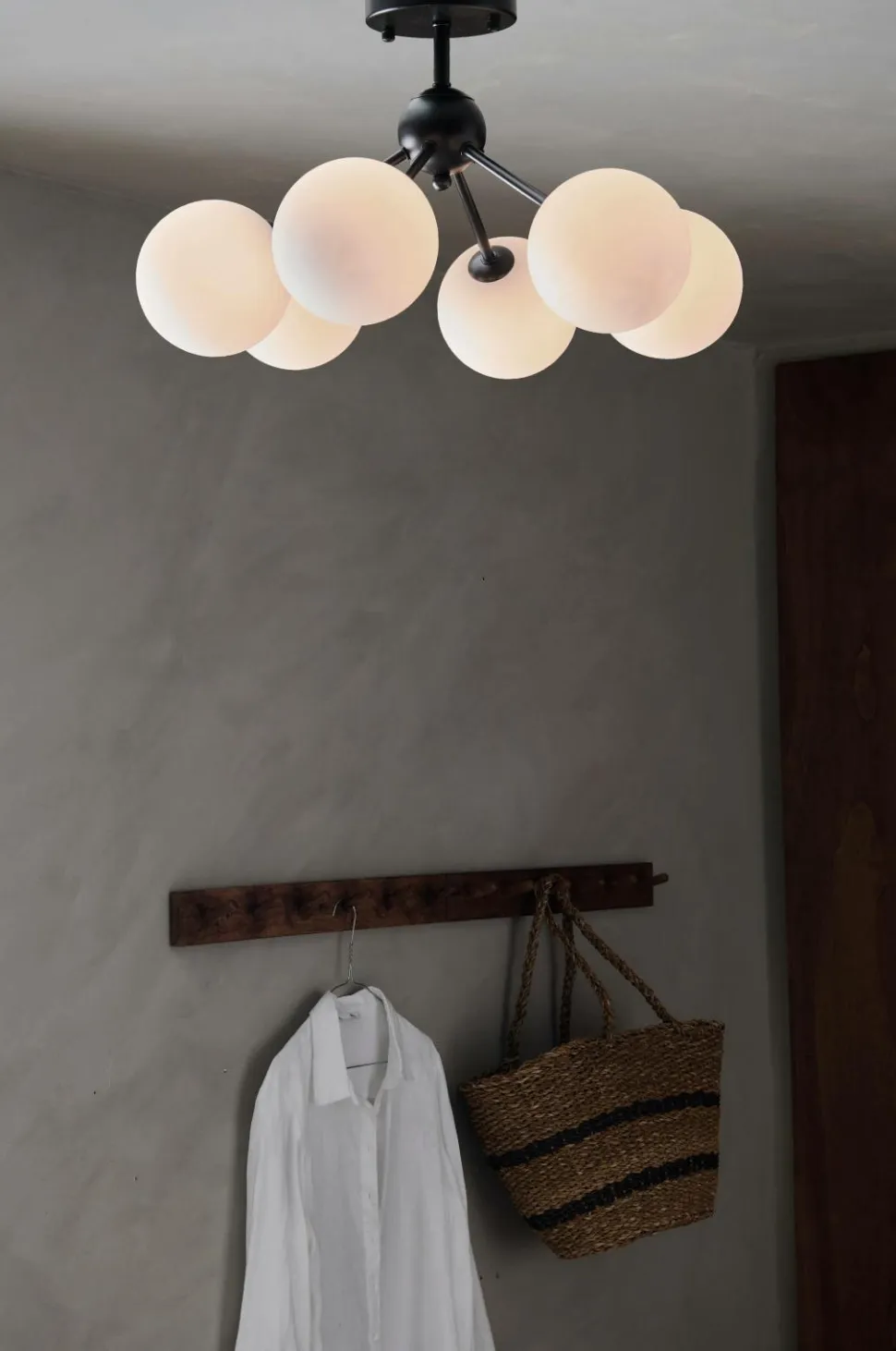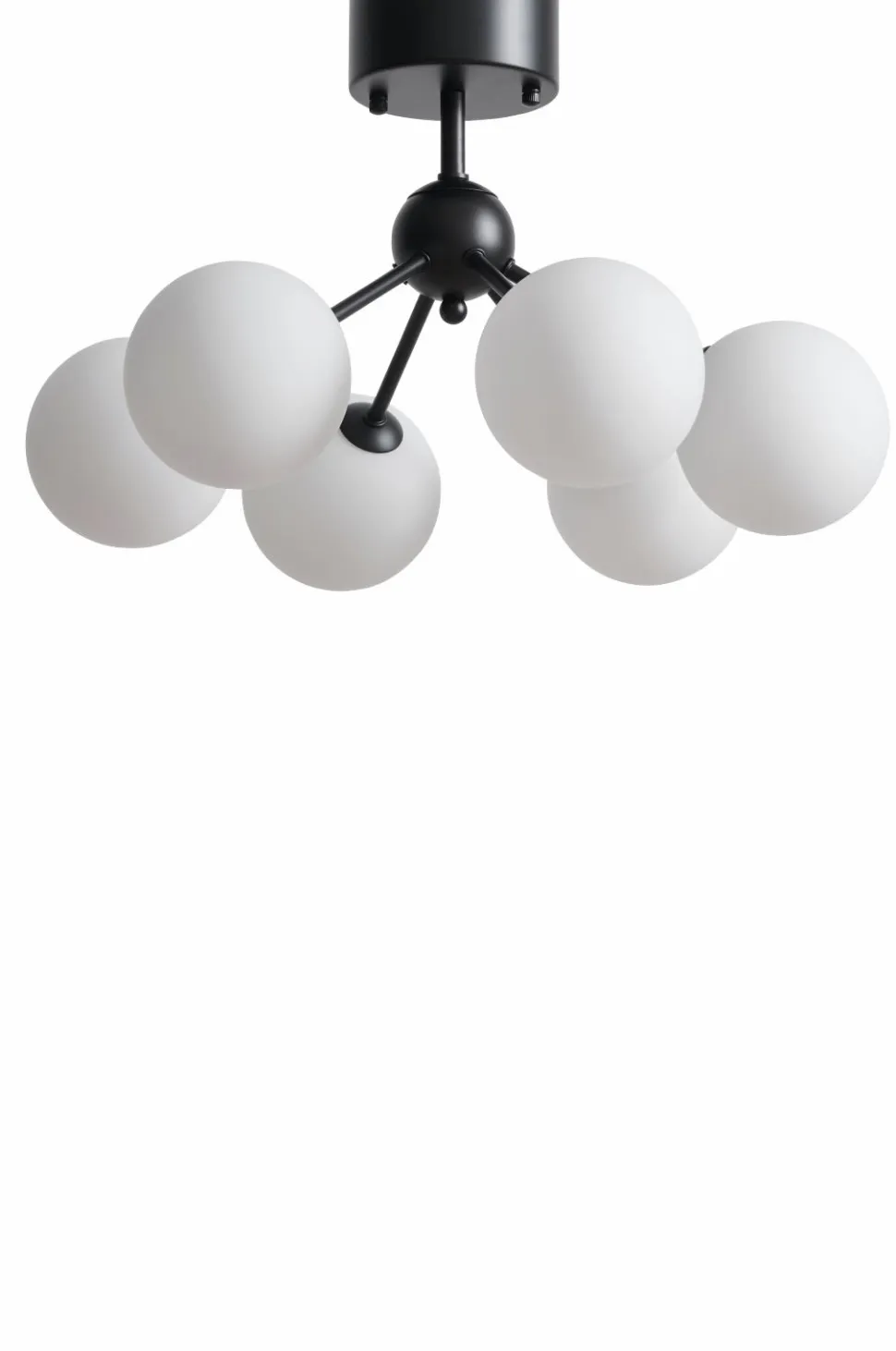 Loftplafond i messingfarvet metal eller pulverlakeret sort metal med 6 opalhvide glaskupler, som fastgøre/løsnes ved at skrue dem. Samlet mål på den monterede lampe: Højde 32 cm, Ø 50 cm. Diameter på glaskuplerne 12 cm. Baldakin af metal. Monteres med bøjleophæng. Sokkel 6xG9 LED maks. 18 W.