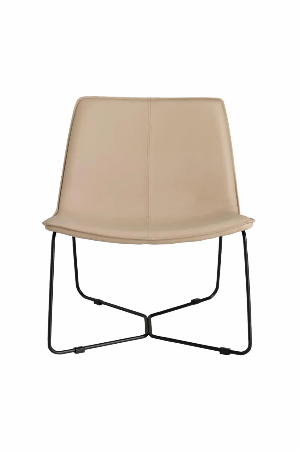 Loungestol i PU-læder (imiteret skind) med et levende tone-i-tone-mønster og jeanssøm midt foran på sæde og ryg. Ben af pulverlakeret metal. Skumfyld.