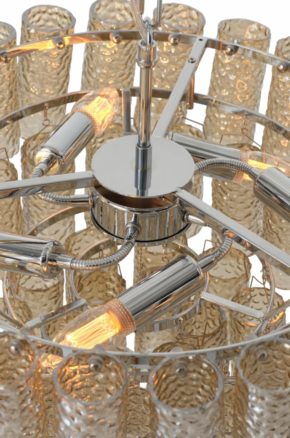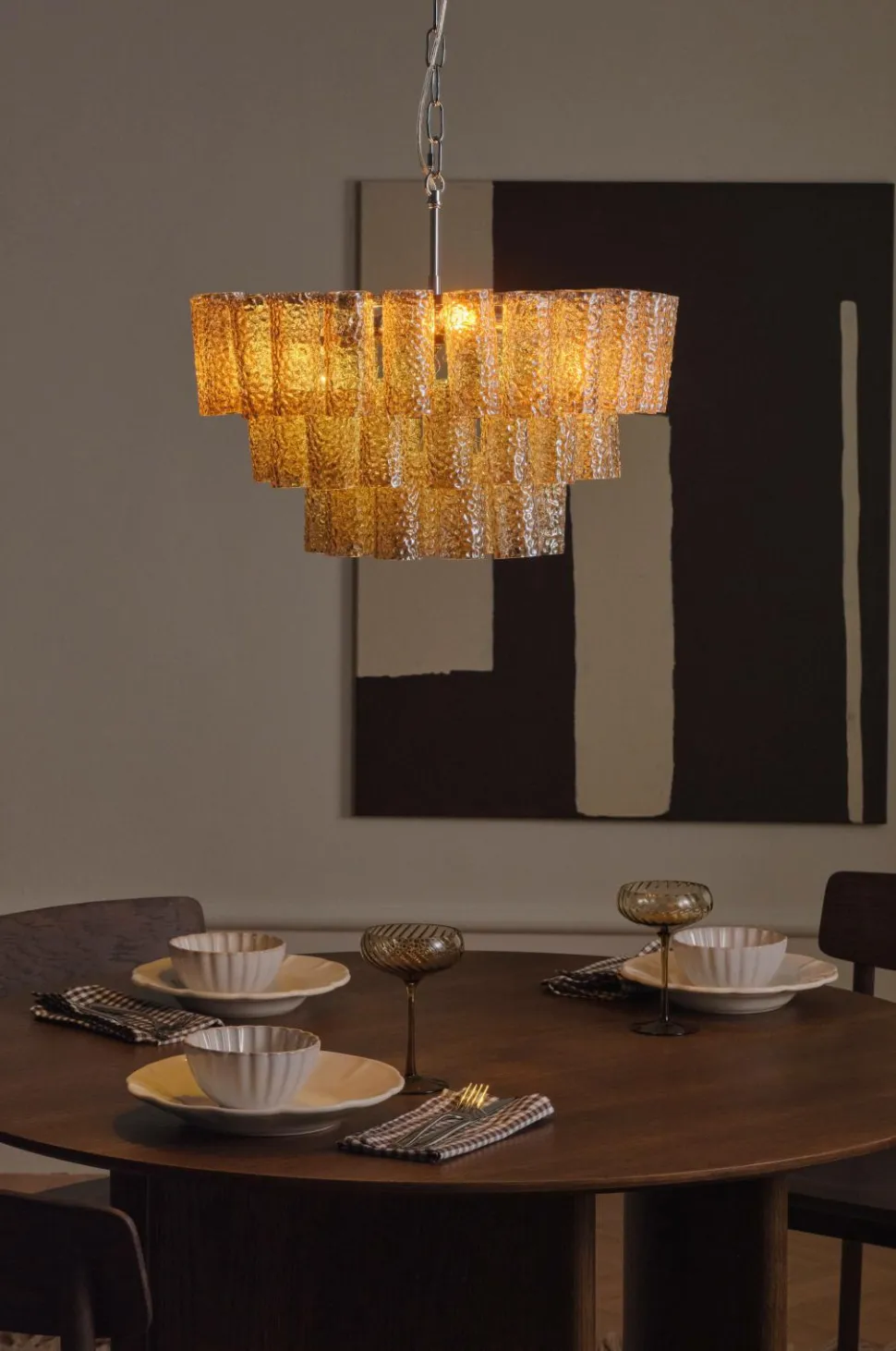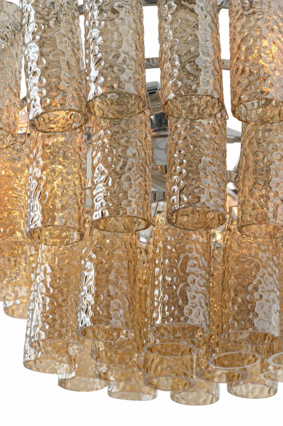 Loftskrone bestående af ravfarvede rør i struktureret glas. Hvert glasrør er håndlavet og mundblæst, hvilket betyder, at udseende og størrelse kan variere en smule for hvert glasrør.