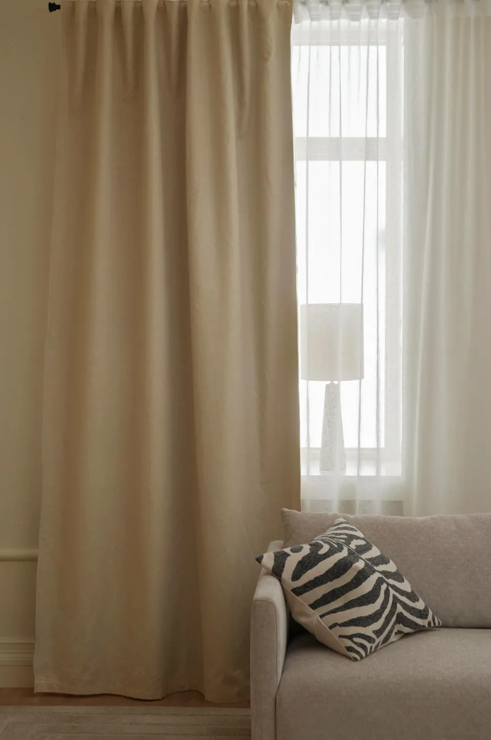 To-lags mørklægningsgardin, et lag i hørblanding og et mørklægningslag i genbrugspolyester.